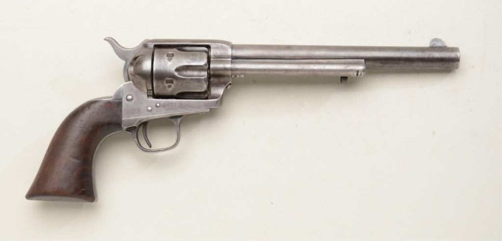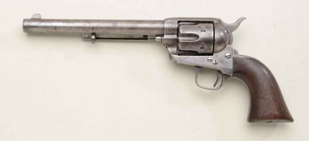 Colt Single Action Army revolver, .45 caliber, 7-1/2” barrel, early civilian series with two-line patent date, serial #26932, made approx. 1875. Factory letter confirms all features except stocks “Not Listed”.Shipped to H&D Folsom Arms Co., New York, NY, September 27th 1876. 50 guns in shipment. The revolver remains in original good to very good condition showing traces of original blue and case hardened finish whereprotected. Evenly drifting to a grey patina with some scattered light erosion and pinprick pitting. There is some bright blue in the flutes of the cylinder and where protected, bottom of ejector rod housing,approx. 5-10%. The wood grips are good with some small tacking marks from hammering horseshoes on the bottom, a couple small losses, but generally good overall with good sharp barrel address and fully legible patent dates. The front sight shows blue and is nearly its full height slimmed just slightly. There are some marks on the bottom of the barrel from removing cylinder pin. The ejector rod housing, cylinder pin, ejector