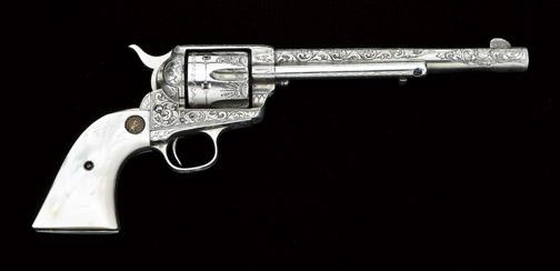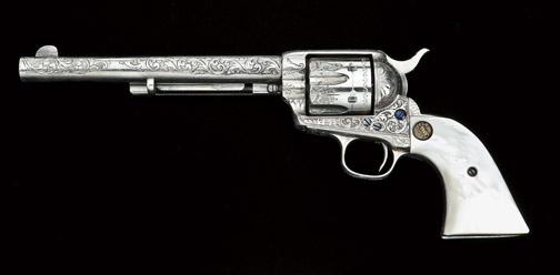 Colt Single Action Army revolver, .45 caliber, 7-1/2” barrel, factory engraved, nickel finish, medallion pearl grips, serial #129317 showing star marking on rear of right triggerguard bow indicating return to the factory, probably for refinishing and regripping. The revolver shows typical 19th century Colt type deluxe engraving with fancy scrolls and borders, The grips show deep medallions. The grips are close but not a perfect fit and may have been supplied at time of refinishing as they are post-1900. The front sight has been reduced slightly and the screws have been reblued with fire. The action is good, the bore is fair. All matching visible numbers. A good-looking factory engraved single-action that was returned after the turn of the century for refinishing and other work. No factory letter available at time of cataloging. Consignor states factory engraved, confirmed by telephone. Est: $12,500 - $17,500