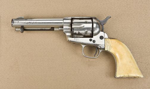 Colt Single Action Army revolver, .45 caliber, barrel reduced to 4-7/8”, nickel finish, ivory grips, serial #61196. Factory letter lists sold to United Stated Government, December 18th, 1880, 200 inshipment, originally blue. The revolver shows DFC inspections on frame, barrel, and serial numbered cylinder. The Colt is obviously an overrun and returned to the factory, who nickeled it and resold it with ivory grips.The back of the left triggerguard bow shows a .45 caliber stamp. The revolver retains approx. 60-80% old nickel finish, areas where the nickel has lifted have gone to a darkish patina with some light to moderate erosionand pitting in these areas. The barrel was shortened long ago and the front sight made of a silver coin. The barrel address is good, the three-line patent dates slightly light. The ivory grips are good to very good andslightly undersize as they have shrunk a little, with some yellowing and age cracking. The initial “H” is neatly cut into top left grip. All matching visible serial numbers, good action, good bore. Est: $3,500 - $5,500