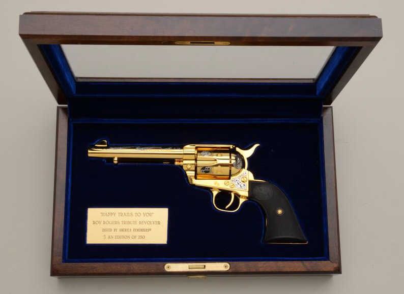 Colt Single Action Army revolver, Cowboy Edition, .45 Colt cal., 5-1/2" barrel, numbered 5 of only 250, entitled "Happy Trails To You, A Roy Rogers Tribute" by A & A Engravers, Rapid City, SD for AmericaRemembers; gold finish with special portraits of Rogers, Trigger and other Roger's motifs. In presentation display case. Possibly the lowest number outside the family, in excellent to near mint condition. Withcertificate from Ernie Worthington, a life-long friend of Roy Rogers who sat on the Board of the Roy Rogers/Dale Evans Museum. Est.: $750-$1,500