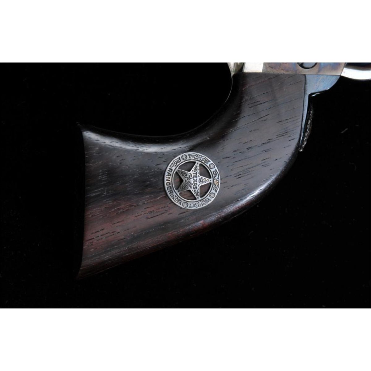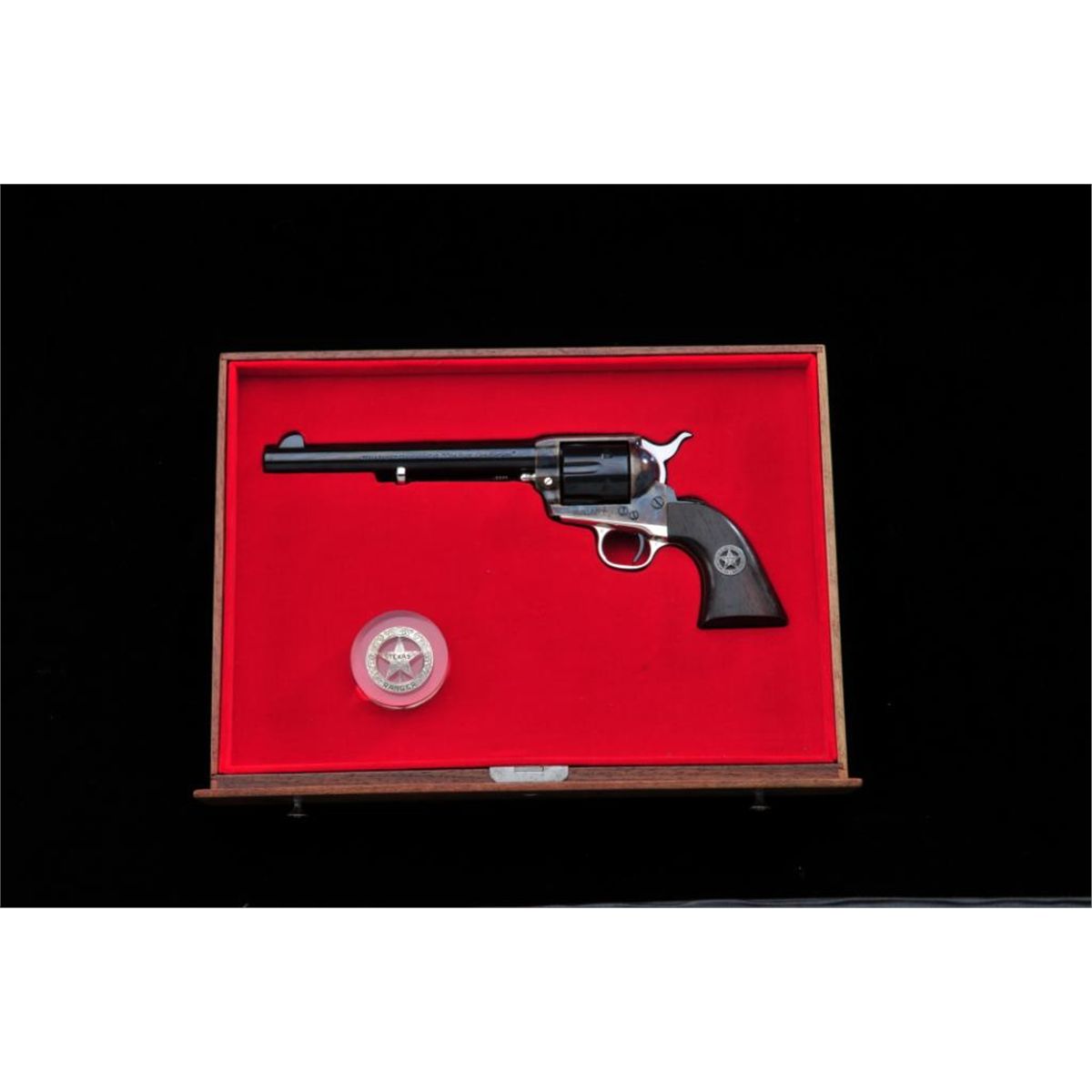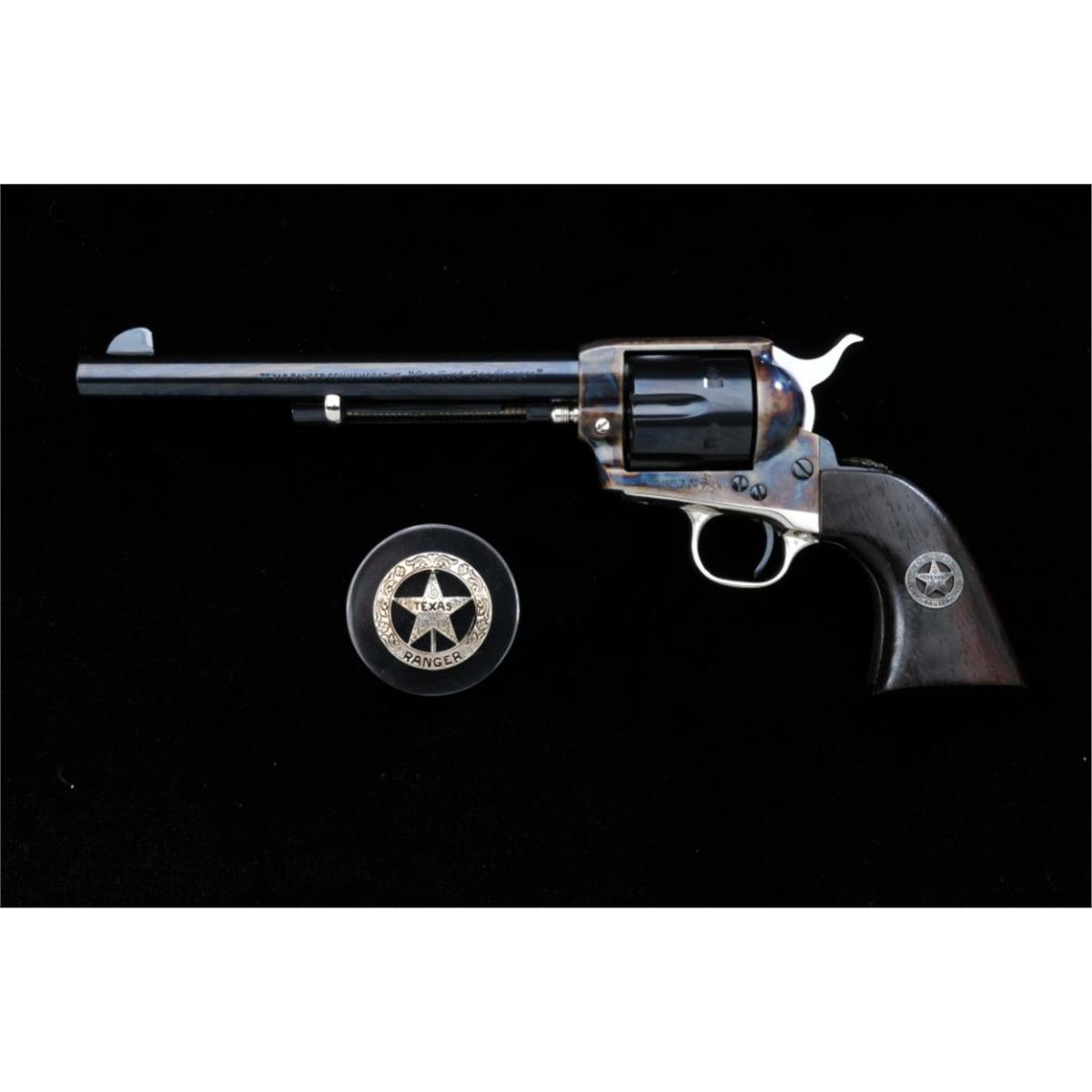 Colt Single Action Army revolver, Texas Ranger commemorative, 7-1/2” barrel, blue and case hardened finish with nickel trim. Select wood grips, silver Texas and Ranger accents, YO Ranch brand, serial #259T[Star}R. Special series financed by Charlie Schreiner of YO Ranch. #259 in series with badge made from Peso, factory display case, and steer hide covered book with unusual three-pages of signatures constituting the Rangers ofcompanies A, B, C, and Headquarters. The pistol is in fine to excellent condition. These are seldom encountered and are increasing in value. Some slight handling and storage marks, no evidence of firing or use. 99% to mint. Est: $1,500 - $3,000