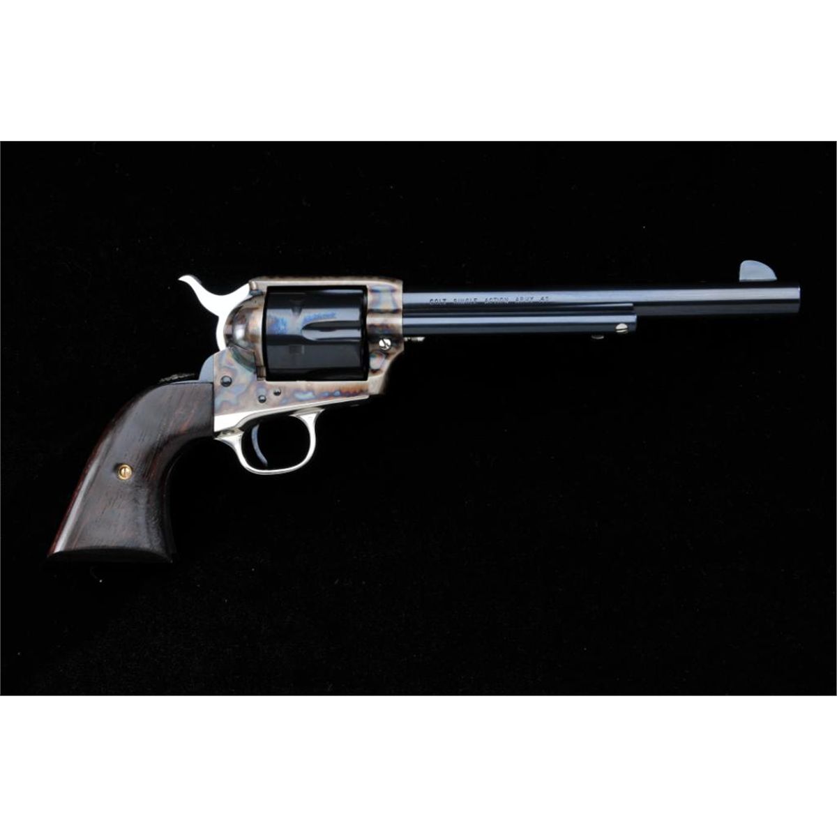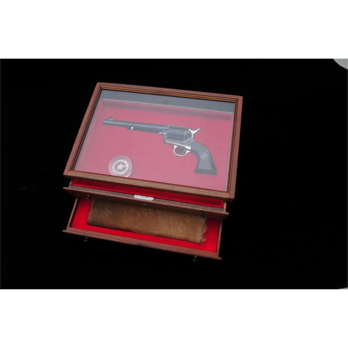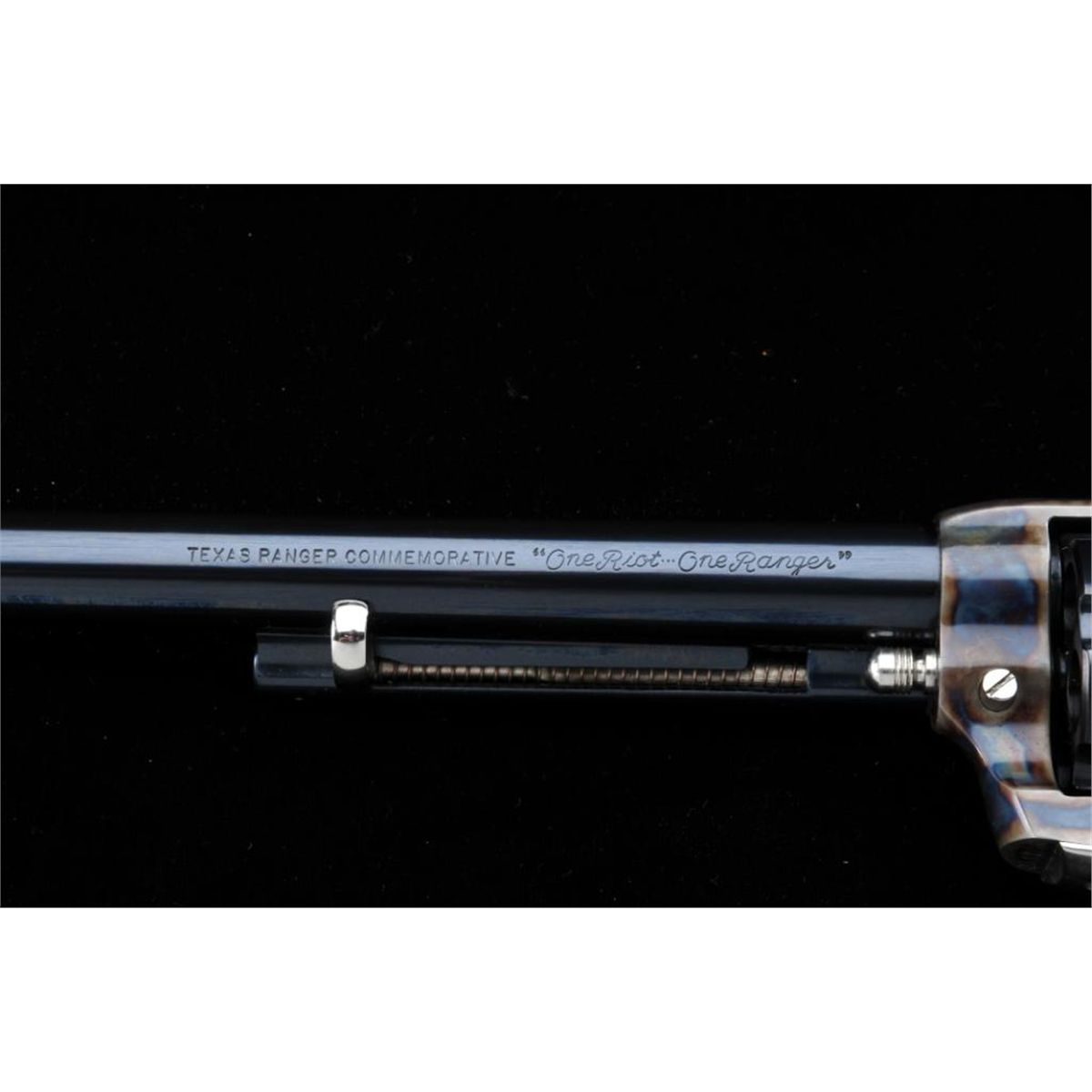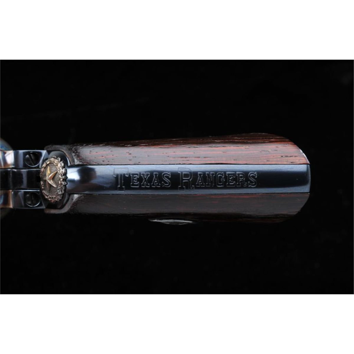 Colt Single Action Army revolver, Texas Ranger commemorative, 7-1/2” barrel, blue and case hardened finish with nickel trim. Select wood grips, silver Texas and Ranger accents, YO Ranch brand, serial #259T[Star}R. Special series financed by Charlie Schreiner of YO Ranch. #259 in series with badge made from Peso, factory display case, and steer hide covered book with unusual three-pages of signatures constituting the Rangers ofcompanies A, B, C, and Headquarters. The pistol is in fine to excellent condition. These are seldom encountered and are increasing in value. Some slight handling and storage marks, no evidence of firing or use. 99% to mint. Est: $1,500 - $3,000