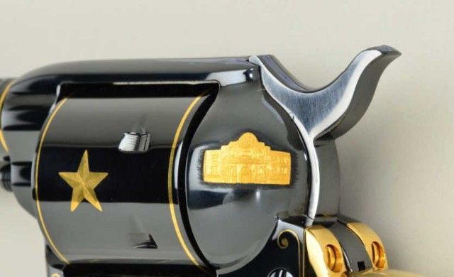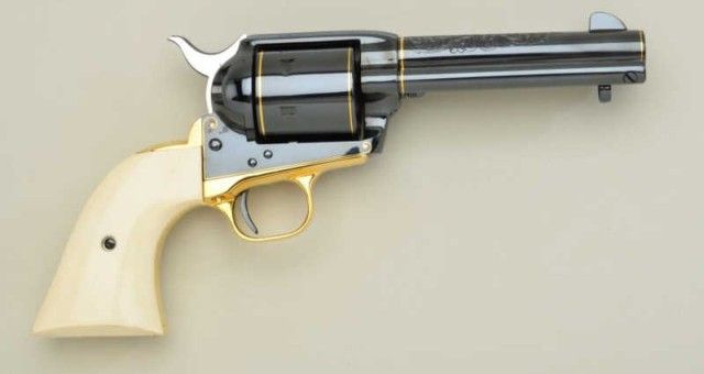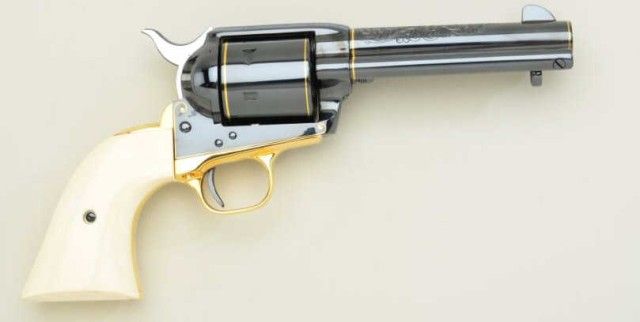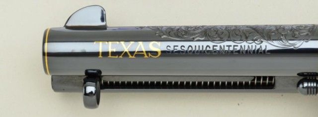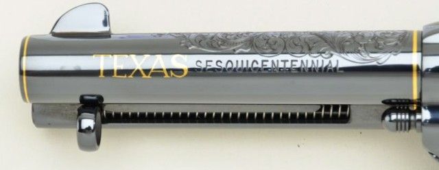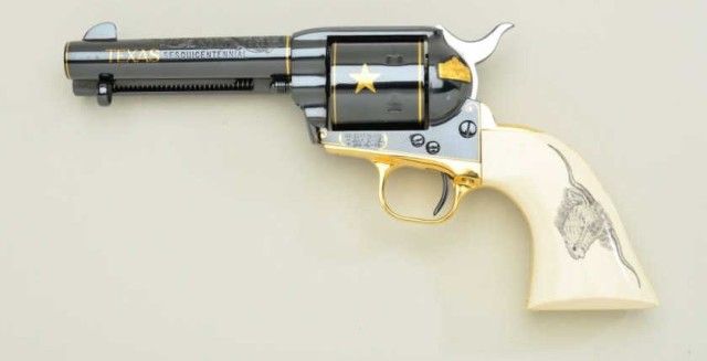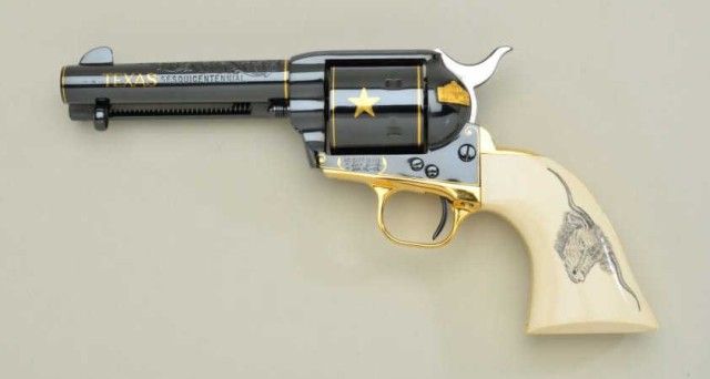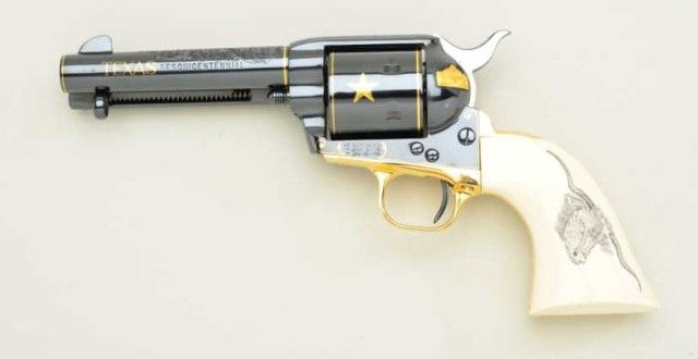 Colt Single Action Army revolver Texas sesquicentennial single action Army revolver Premier Edition, one of seventy-five made, serial #TEXAS45. The revolver shows a 4-3/4” barrel with mirror bright blue finish and 24 carat gold plated accents, the grips are genuine scrimshawed ivory with steer head on left and factory engraved and gold inlayed with Texas motifs showing star, Alamo, line and border engraving with flush and raisedgold, black powder patent dates and center pin with round cylinder and deluxe glass mahogany case which stands the pistol up vertically. Shipped Sept. 27th 1985 with all features verified by factory letter.Excellent to mint condition with original cardboard box showing proper end label from custom workshop. Est.; $5,000-$10,000.