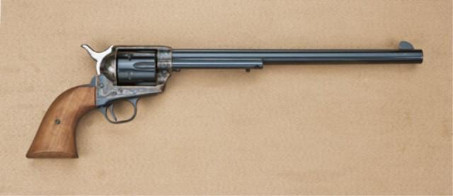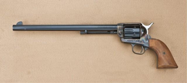 Colt Single Action Army revolver, buntline series, 2nd Gen, serial #18933SA with “BB1505” stamped beneath the barrel. 12” barrel, blue and case hardened finish, wood grips. The barrel and cylinder show 98-99% blue, a small mark 1” from the muzzle from being dropped. Some slight wear at the edges. The backstrap and triggerguard show 98-99% blue, the hammer shows a slight amount of storage rust. The frame shows 95-98% case hardening and just some beginning age from lack of oil. The grips are fine to near excellent. The “BB” on the barrel was only found on the early 2nd Gen buntlines. It was placed on them to avoid forgery. From the Robert Petersen Collection. Est: $1,250 - $2,500