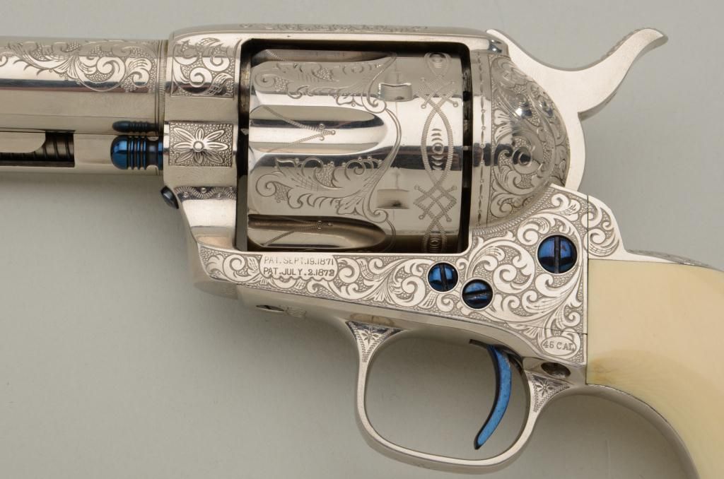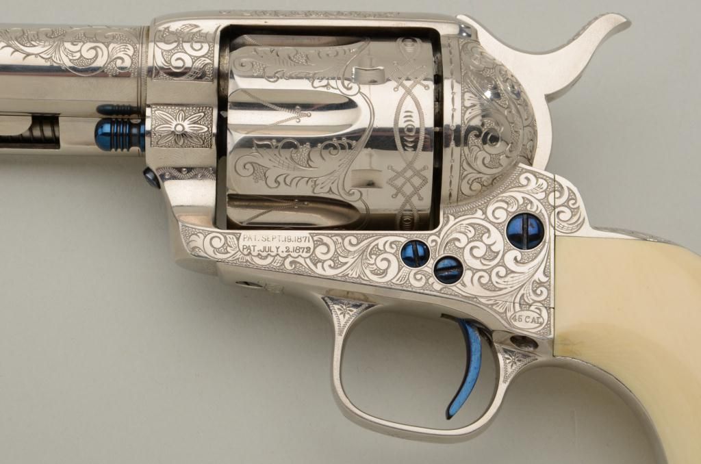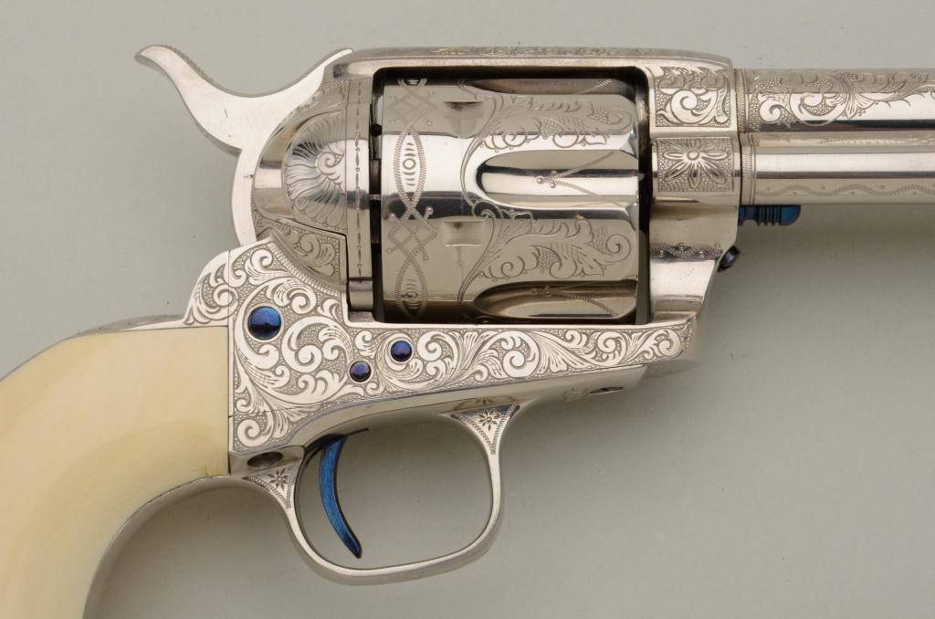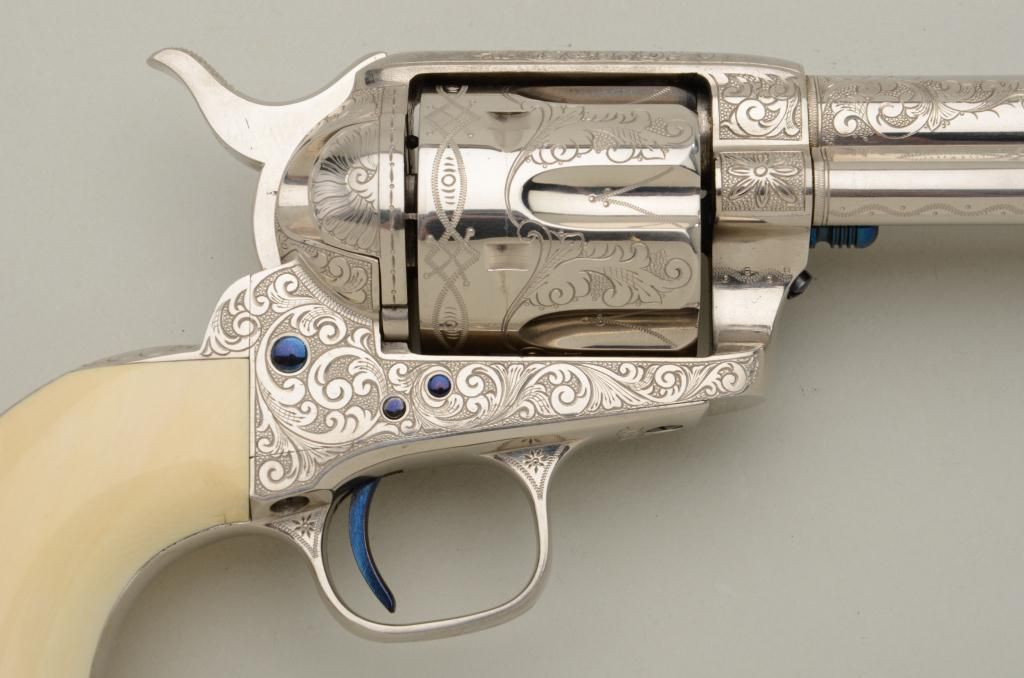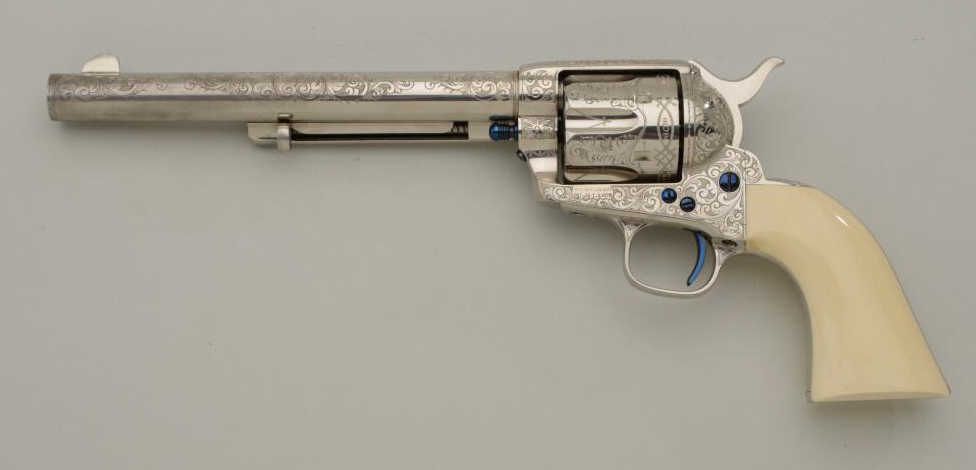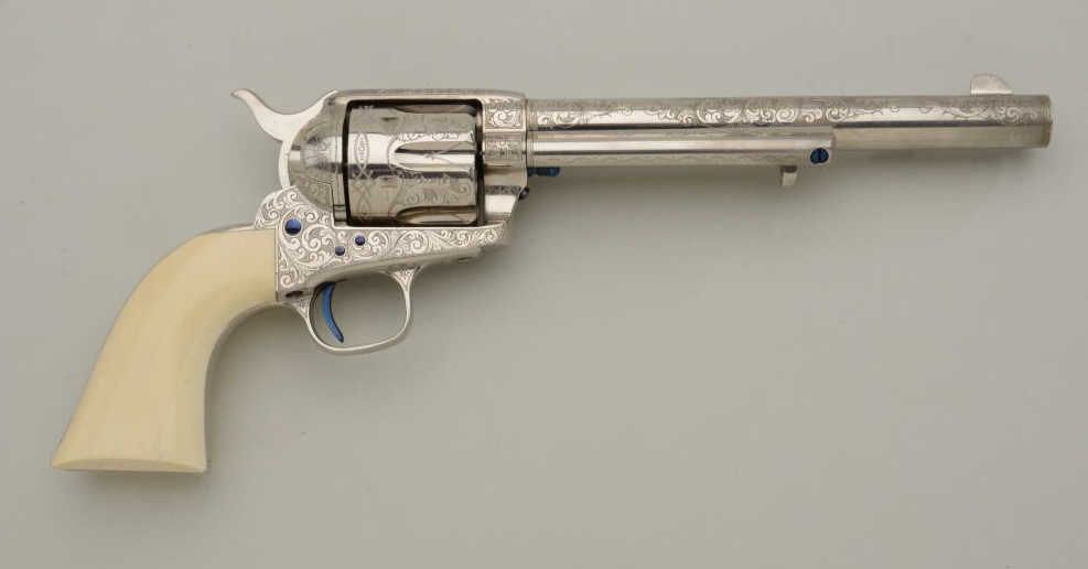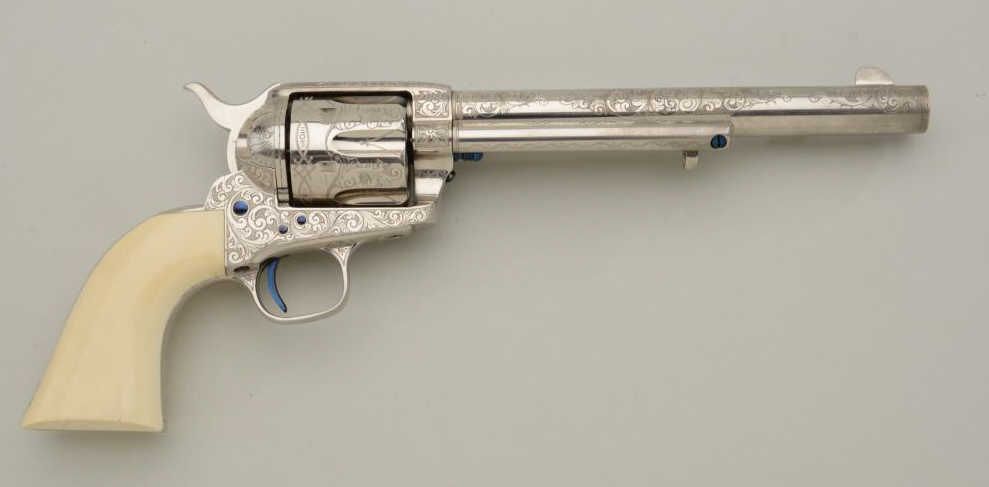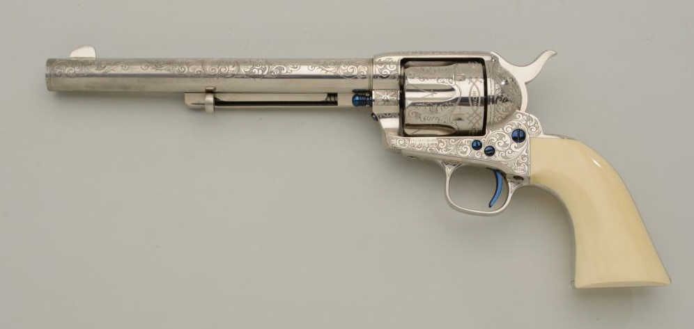 Colt Single Action Army revolver early black powder era, serial number 1352 showing italic barrel address and finely engraved by Ernie Lyttle and signed by him beneath trigger guard on interior. This Colt has been fullyprofessionally restored and shows early round front to the frame. Two line patent dates and other very early features. This Colt is very nicely New York style scroll engraved in 19 century motives with a fine treatmentaround the front sight similar to 1876 exhibition engraved Colts. This colt has been nicely polished and real nickel plated with fire blue screws and early black powder cylinder pin and ejector rod head. The pistol is fitted with an excellent pair of ivory grips that are beautifully made and fitted impeccably showing no screw holes. A very attractive engraved colt which re-creates the style of the 1870s very nicely. With factory letter. The bore is bright and overall condition is excellent as restored at time of engraving. This would be a very expensive pistol to re-create at today’s prices probably over $10,000. Est.: $2,750-$5,500
