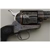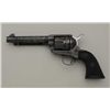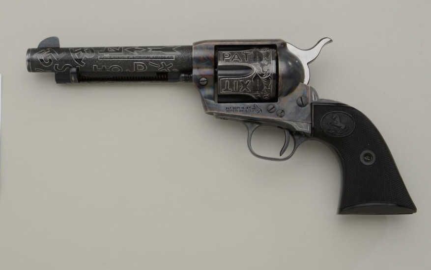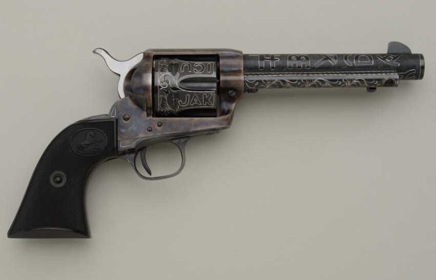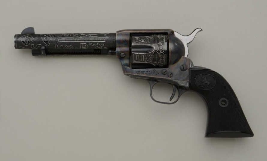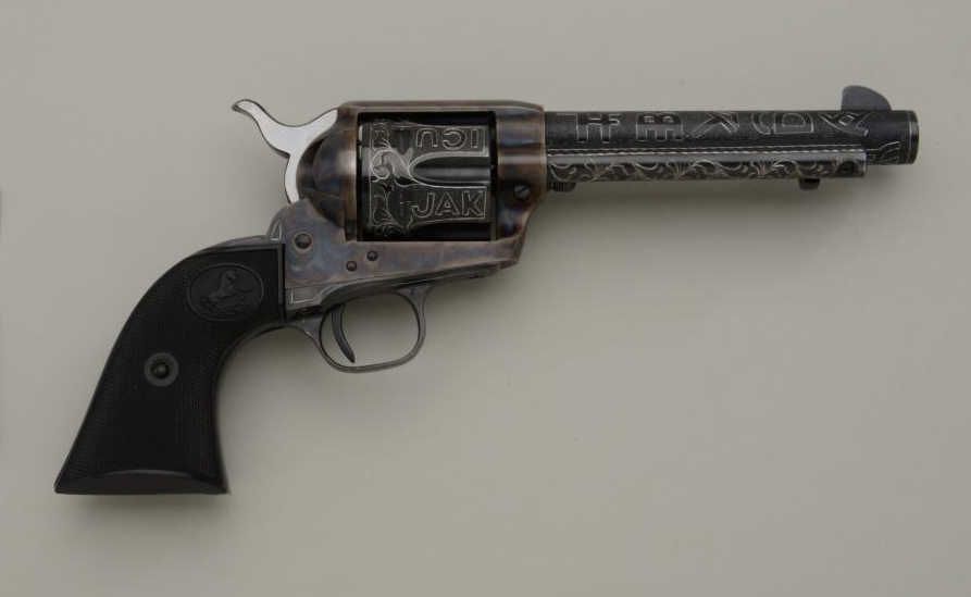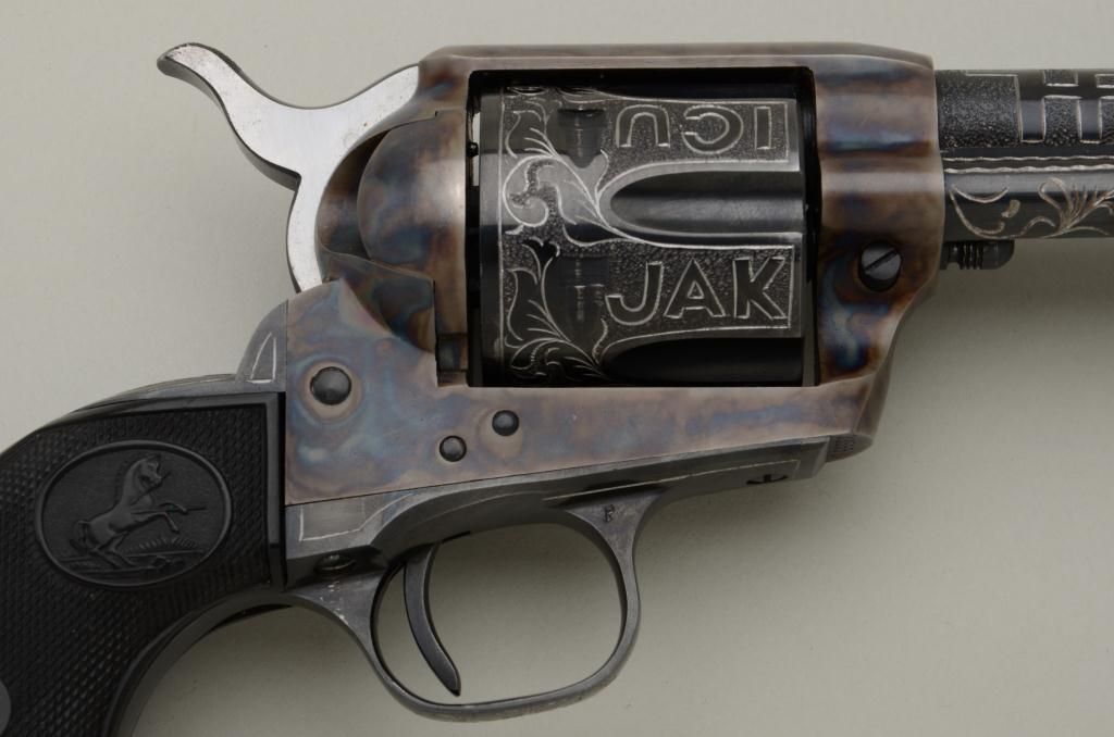 Colt Single Action Army revolver early second-generation in .45 long Colt caliber with 5 ½” barrel, blue and case hardened finish, hard rubber grips, fully cattle brand engraved on barrel, cylinder, back strap and trigger guard. The cattle brand engraving shows stippled background and is hand engraved probably by Weldon Bledsoe or possibly Cole Agee. This pistol remains in excellent condition with 98% to 99% originalblue and case hardening with no discoloration in the engraved bright areas. The action is good and the bore is excellent. The Colt has seen very little use. Our consignor states that the engraving was done more than 30years ago as it was engraved when he purchased it. Est.: $1,500-$3,000.