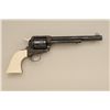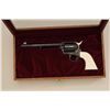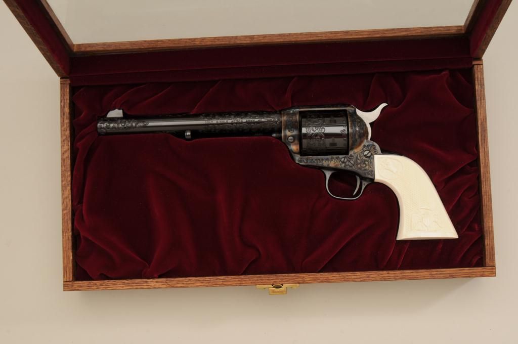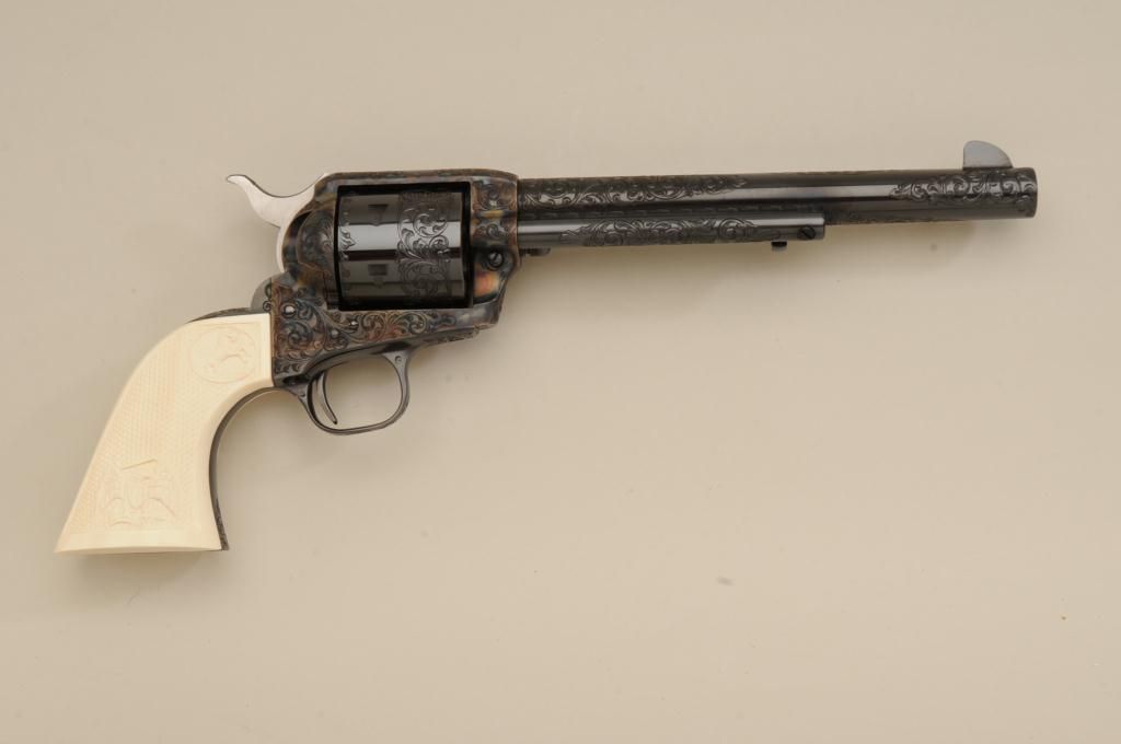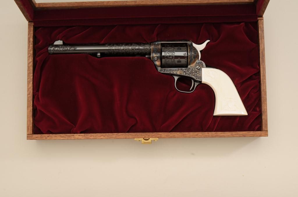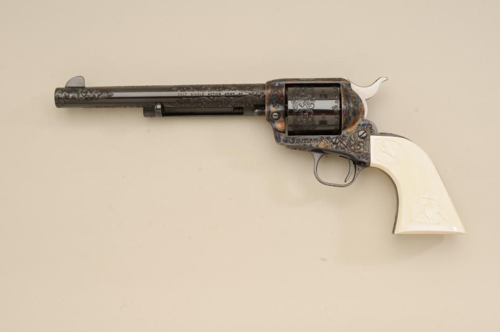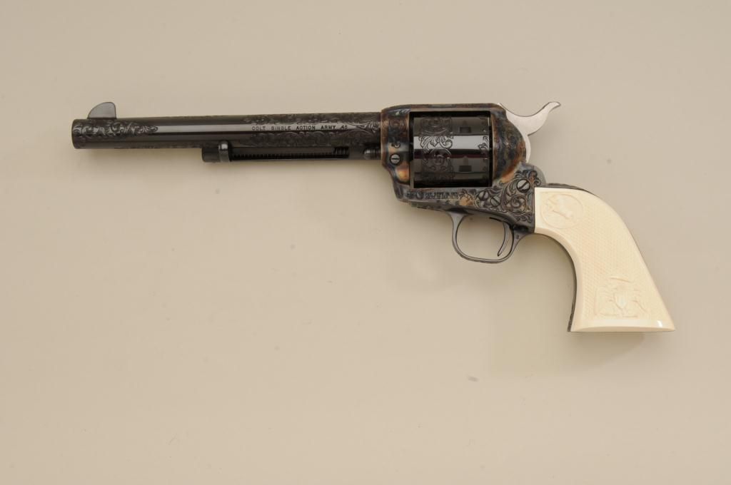 Colt Single Action Army revolver factory engraved, .45 long Colt caliber, blue and case hardened finish, grade C, serial number 93760SA, shipped November 21, 1978 to Valley Gun Distributors with 3 guns and shipment.The revolver shows an open scroll type engraving possibly A. A. White engraving company but not mentioned in the letter. The revolver also shows aftermarket checkered and carved ivory grips with American Eagle andrampant Colt in relief. The grips are carved on both sides and fit well. The pistol shows a non-fluted cylinder which is also factory and all parts are correct. also included is a Colt Custom Workshop box and glass top Coltdisplay box. Condition is fine to excellent with 98% to 99% plus original blue and case with just slight beginning age. Est.: $1750-$3500