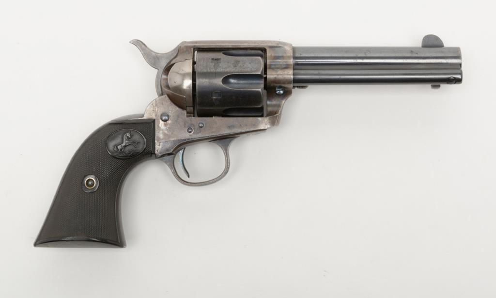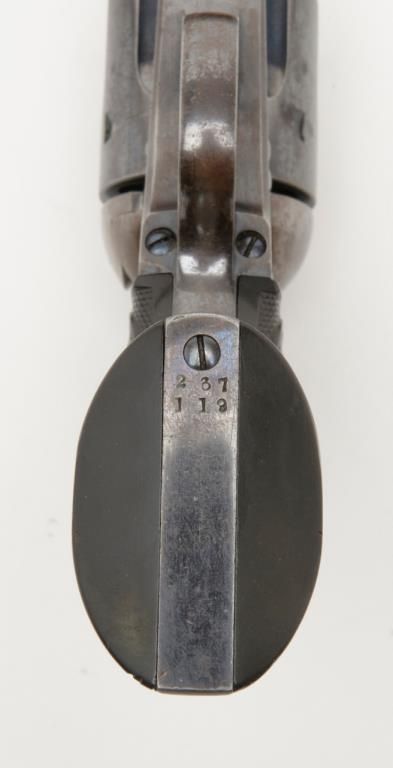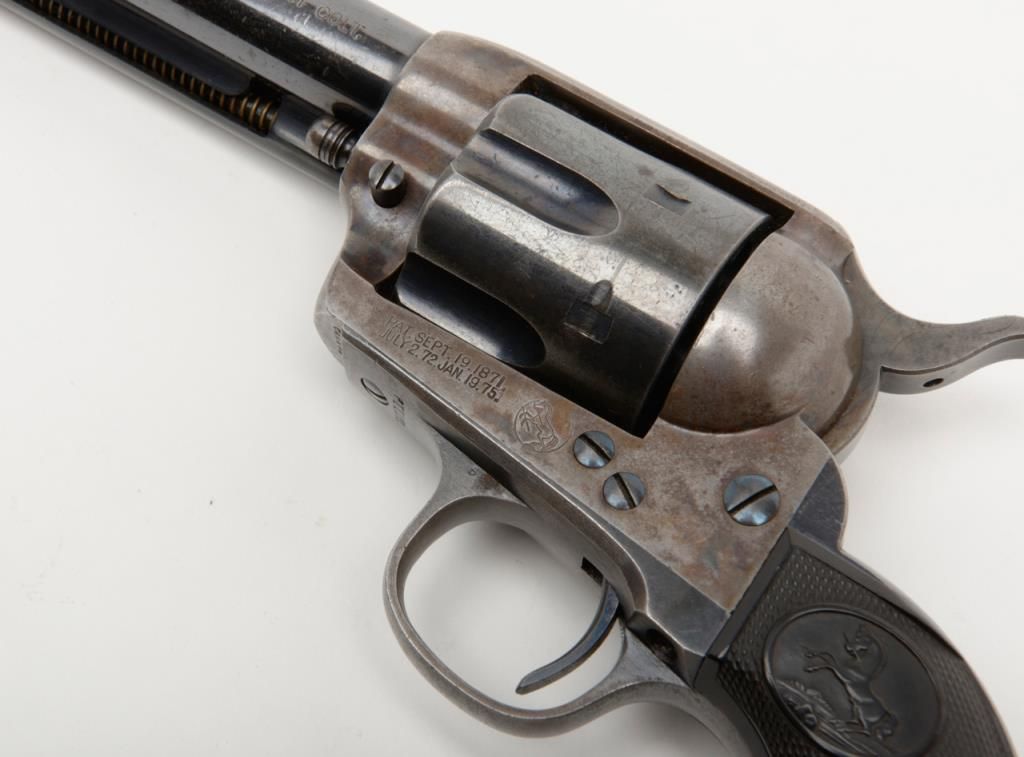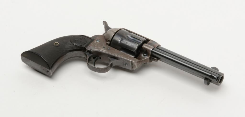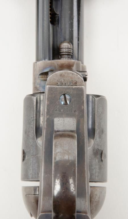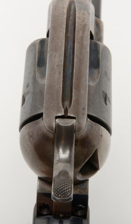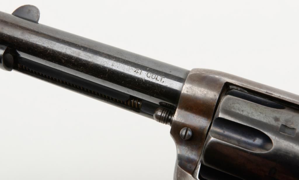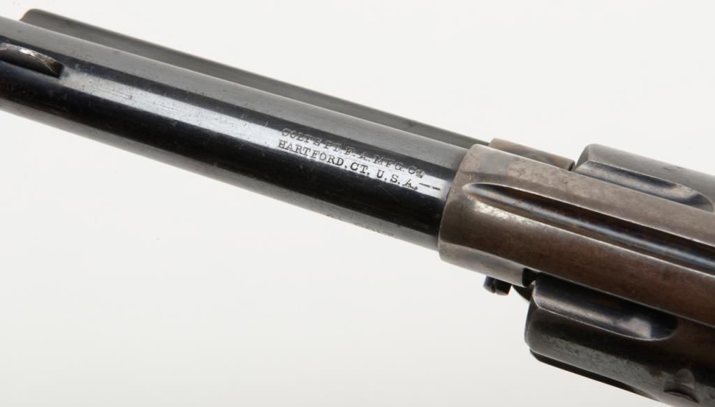 Colt Single Action Army revolver in .41 Colt caliber with 4 ¾” barrel retaining considerable original blue and case hardened finish with hard rubber grips, serial number 267119. This Single Action remains in very good plus originalcondition showing 75% to 85% original bright blue on the barrel with some thinning on the left side from being holstered. The barrel address is sharp and crisp and the front sight is its full original dimensions. The ejector rod housing shows most of its original blue as does the ejector rod. The cylinder shows 50% to 70% thinning original blue with a slight index line and some bright blue in the flutes. The frame shows 30% to 50% case hardening which is drifting to a patinawith some very colorful and rainbow colors where protected. The trigger guard and back strap show 50% to 70% thinning original blue. The screws and small parts show bright original fire blue finish. The hammer shows 50% plus original casehardening. The grips are very good with slight edge wear and fit impeccably. The action works well and the bore is bright. All matching visible serial numbers. Factory letter confirms all features and shipped to J. F. Schmelzer, Kansas