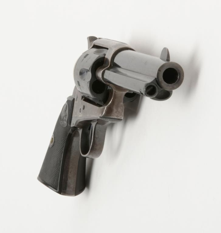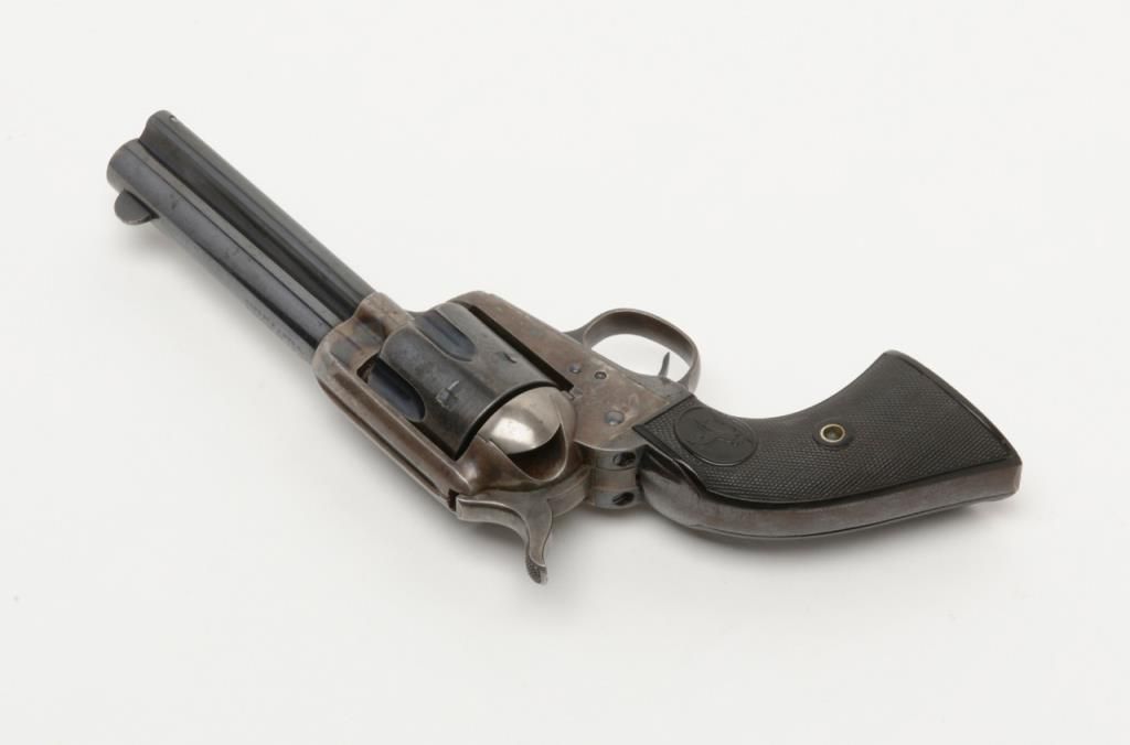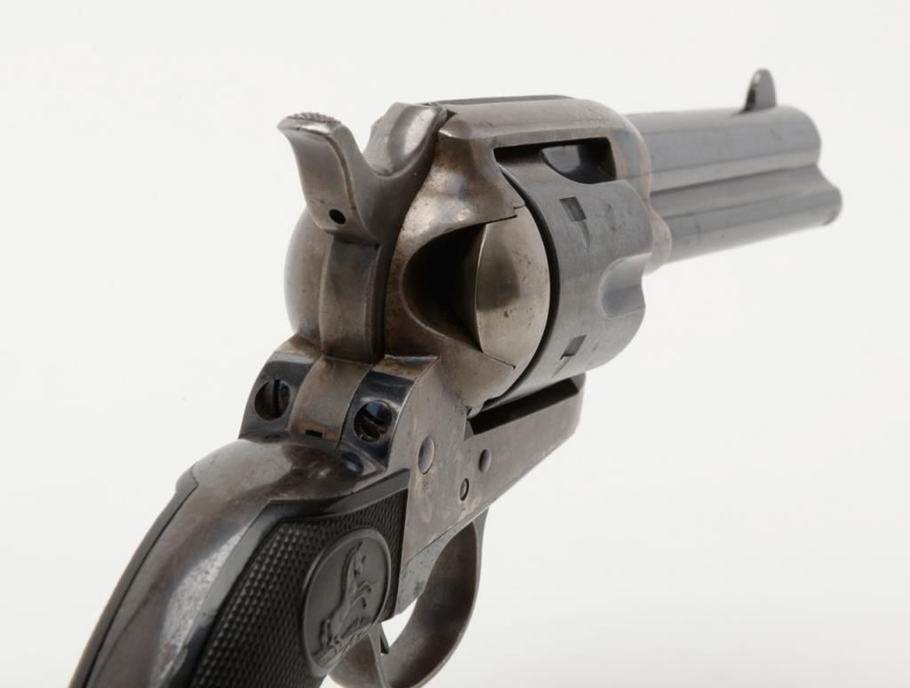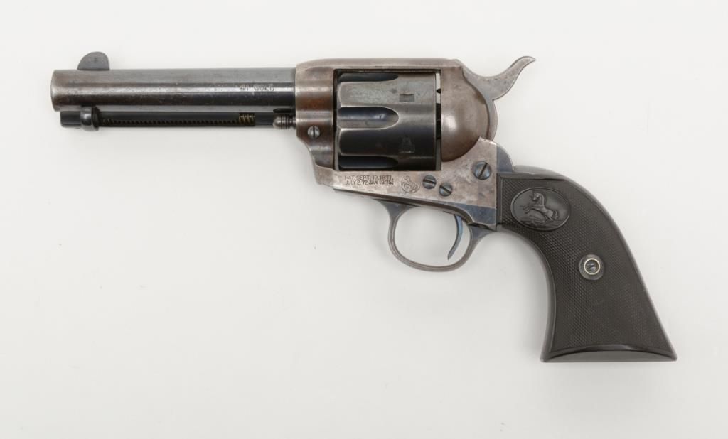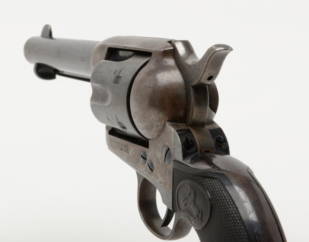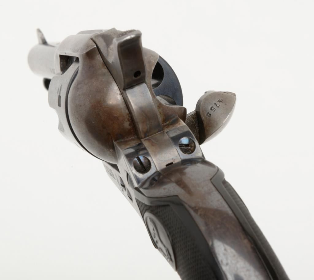 Colt Single Action Army revolver in .41 Colt caliber with 4 ¾” barrel retaining considerable original blue and case hardened finish with hard rubber grips, serial number 267119. This Single Action remains in very good plus originalcondition showing 75% to 85% original bright blue on the barrel with some thinning on the left side from being holstered. The barrel address is sharp and crisp and the front sight is its full original dimensions. The ejector rod housing shows most of its original blue as does the ejector rod. The cylinder shows 50% to 70% thinning original blue with a slight index line and some bright blue in the flutes. The frame shows 30% to 50% case hardening which is drifting to a patinawith some very colorful and rainbow colors where protected. The trigger guard and back strap show 50% to 70% thinning original blue. The screws and small parts show bright original fire blue finish. The hammer shows 50% plus original casehardening. The grips are very good with slight edge wear and fit impeccably. The action works well and the bore is bright. All matching visible serial numbers. Factory letter confirms all features and shipped to J. F. Schmelzer, Kansas