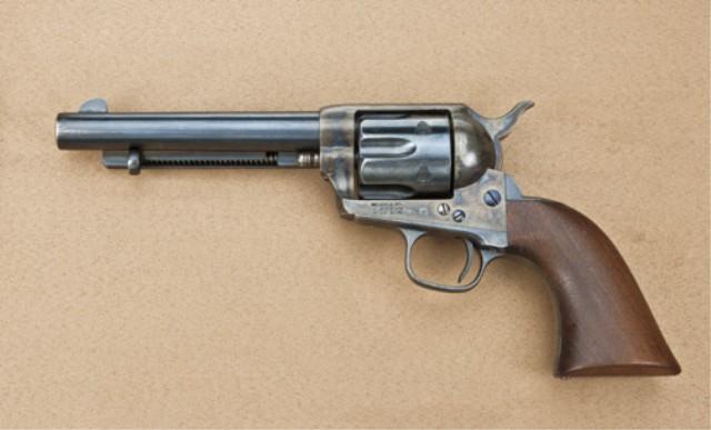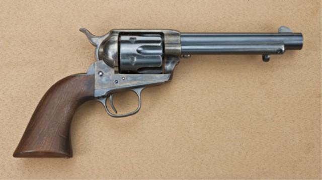 Colt Single Action Army revolver, originally US cavalry series, barrel shortened to 5-1/2” in the artillery style, reblued and re-casehardened finish, replace military style walnut grips with no cartouches, Henry Nettleton inspected, serial #49172. The pistol shows all matching visible serial numbers and “W” sub-inspection on barrel (Wheeler). All other major parts show Henry Nettleton inspection except grips which are not cartouched. The pistol is near an example 49300 which went to Cebu Police and 49284 which went to the New York militia. The pistol shows 95-98% of what appears to be an arsenal or factory reblued finish, similar to artilleries. Some slight wear at the edges and cylinder. Slight index line, but very little use since refinishing. The backstrap and triggerguard show proper streaking which is found in this range. All proper marks, HN on backstrap, except hammer an unmarked arsenal replacement of the 1890’s which is case-hardened matching the frame. An early type ejector rod housing, ejector rod head and spring of the correct type for the early barrel match up perfectly. A very interesting Henry Nettleton full matching “artillery” that may have been rebuilt