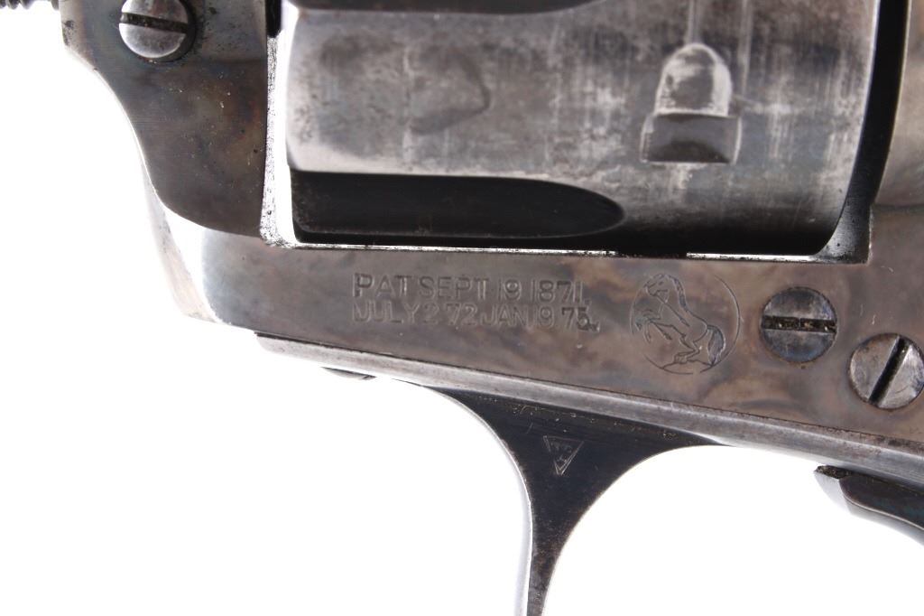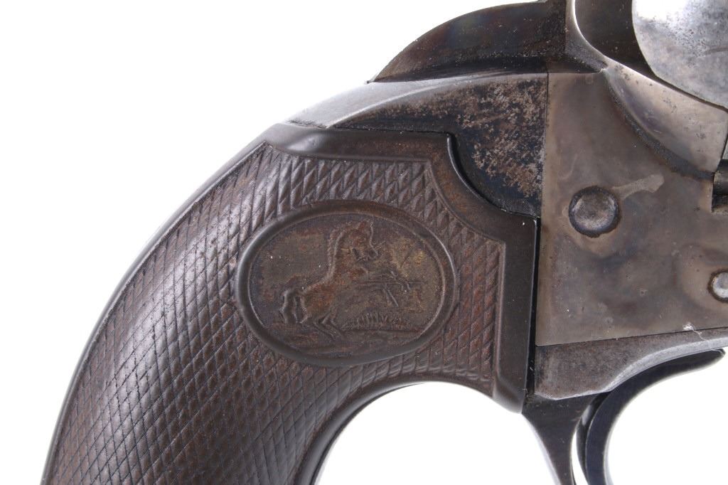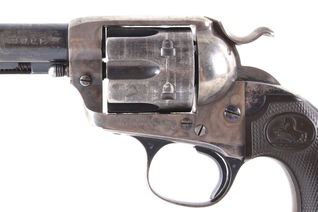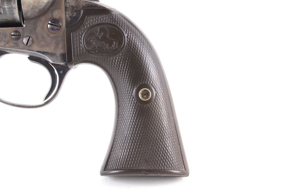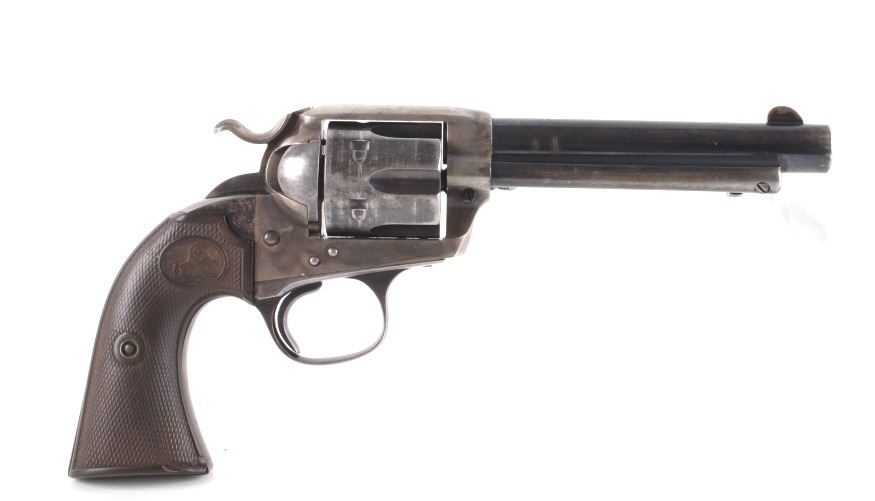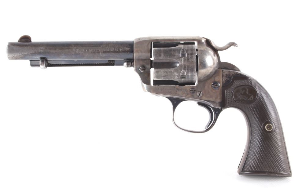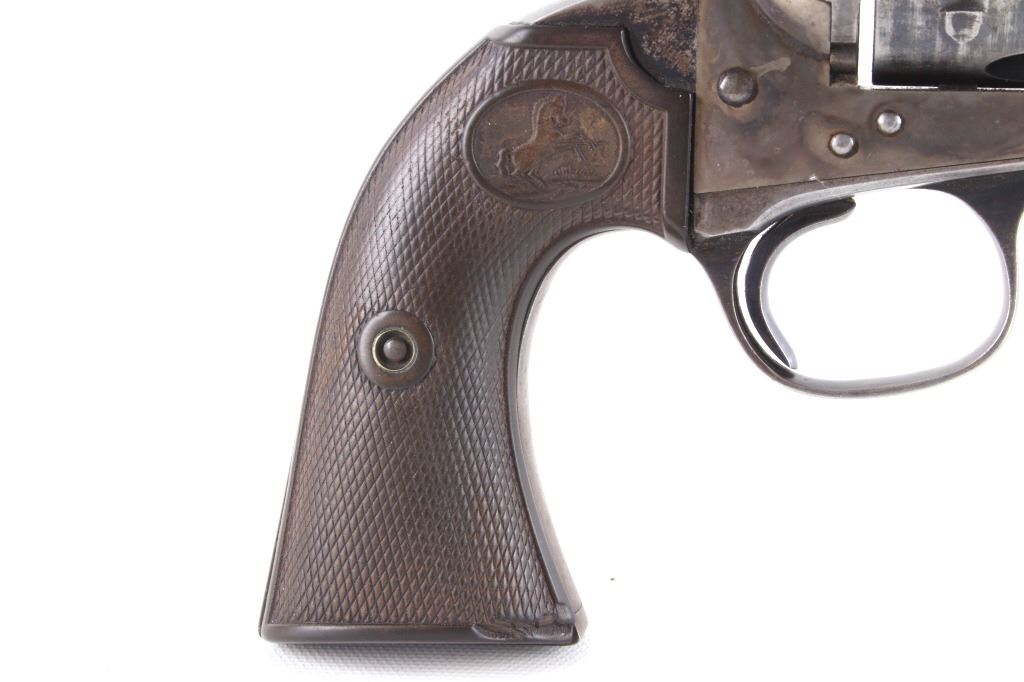 Thus, the .38-40 firing a 180 grain slug ahead of a full 40 grain charge of black powder was considered a very powerful handgun round. Later, the cartridge was loaded to the same velocity using cleaner burning smokeless powder. Colt Single Action Bisley revolvers found favor on the frontier and especially in the Southwestern United States. Most found today show hard use and often abuse. Rarely are they found with any appreciable finish remaining. This is an outstanding example that retains fine deep barrel and ejector housing blue with only normal light gray on the left side of the barrel and on the forward portion of the ejector housing from holster carry. The cylinder also shows fine thinning blue. The bottom of the trigger guard retains fine blue and only the grip straps are aging to gray/brown with good blue in the upper protected areas. Similarly, the butt shows fine deep blue. Remarkably, the frame retains fine light case colors with vivid case colors in the more protected areas- finding any case color on a Bisley is a true rarity. Bisley and Single Actions of this era rarely retain this much blue and case color making this example exceptional. All markings are clear with the correct “BISLEY MODEL” and caliber stamping on the left side of the barrel and Colt address on the top. The frame patent dates and rampant colt are also sharp and clear. The original checkered hard rubber grips are in fine condition showing only light wear and minor chipping at the bottom edge. The screw heads all appear excellent