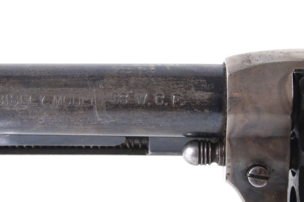 Colt Single Action Bisley Model revolver in .38-40 caliber with 5 ½” barrel, complete with holster. This very high condition Bisley with serial number 316578 was made in 1911. The most common caliber for the Bisley model was .32-20. Any other caliber could be considered more desirable. The .38-40 cartridge is simply the .44-40 necked down to take a “.40” diameter bullet- why Colt and Winchester didn’t name this cartridge the “.40-40” is a mystery as it does NOT fire a .38 caliber bullet!