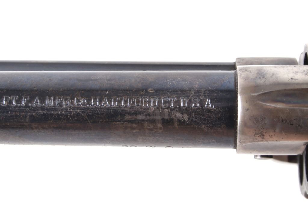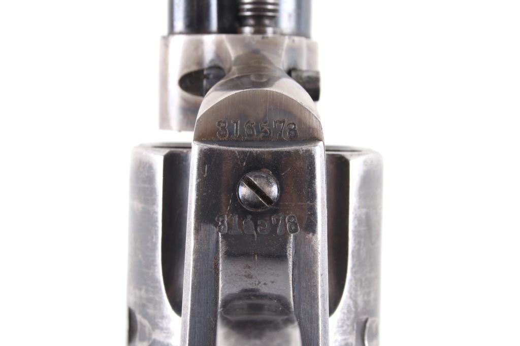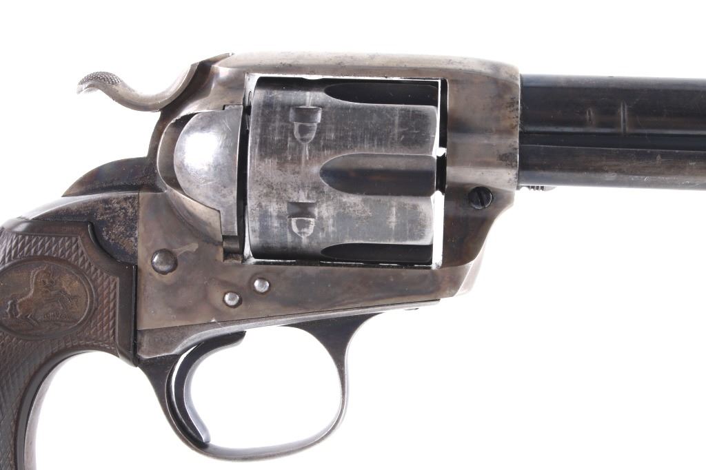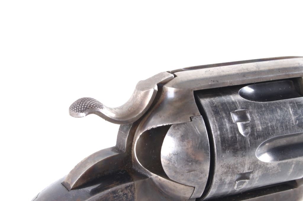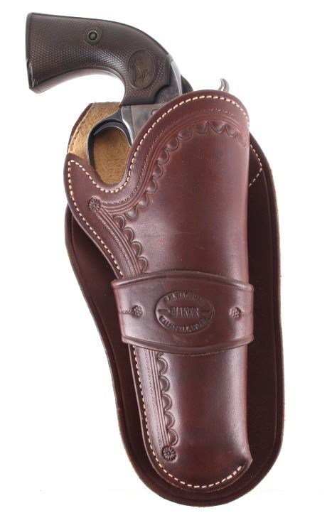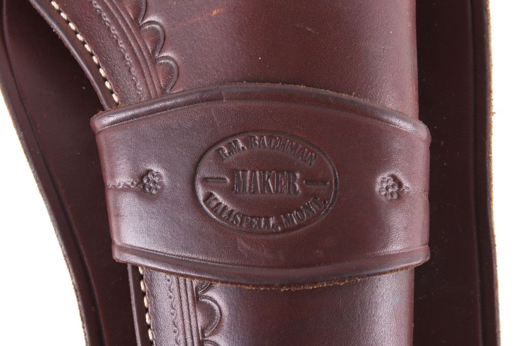 and some retain their original fire blue. The cylinder pin is also unmarred which is unusual and desirable. There is also good fire blue on the trigger sides along with good case color on much of the hammer. Also, the front sight has not been filed or altered and the bore is mirror-bright minty. The action is tight and the hammer has the correct four clicks. The included period correct style Mexican Loop holster was recently made by famed holster maker R. M. Bachman of Kalispell, Montana. It is