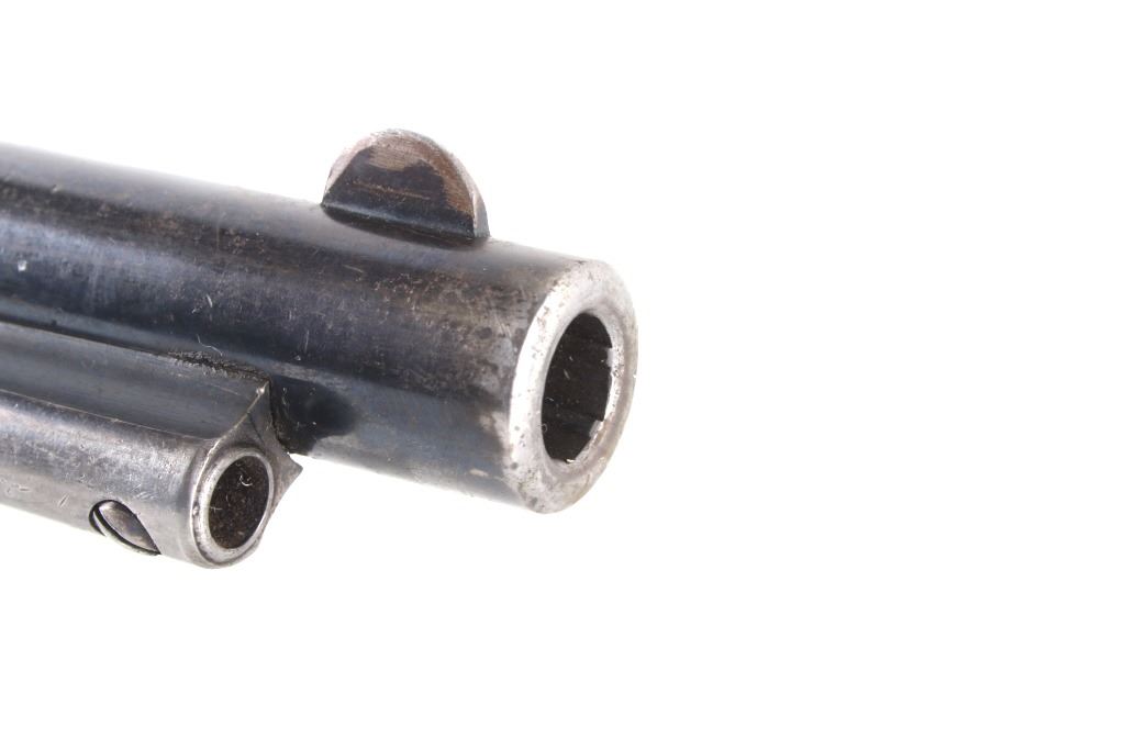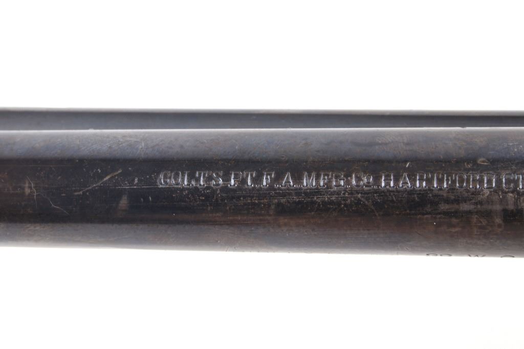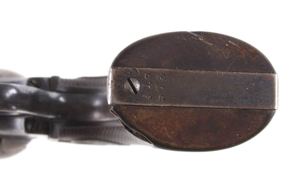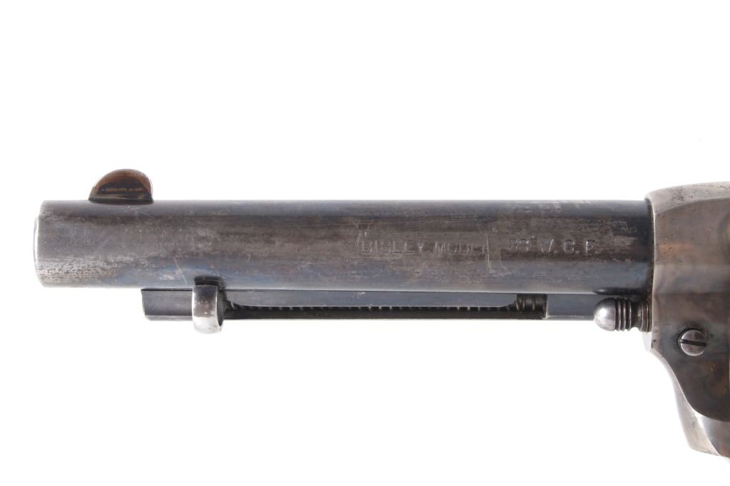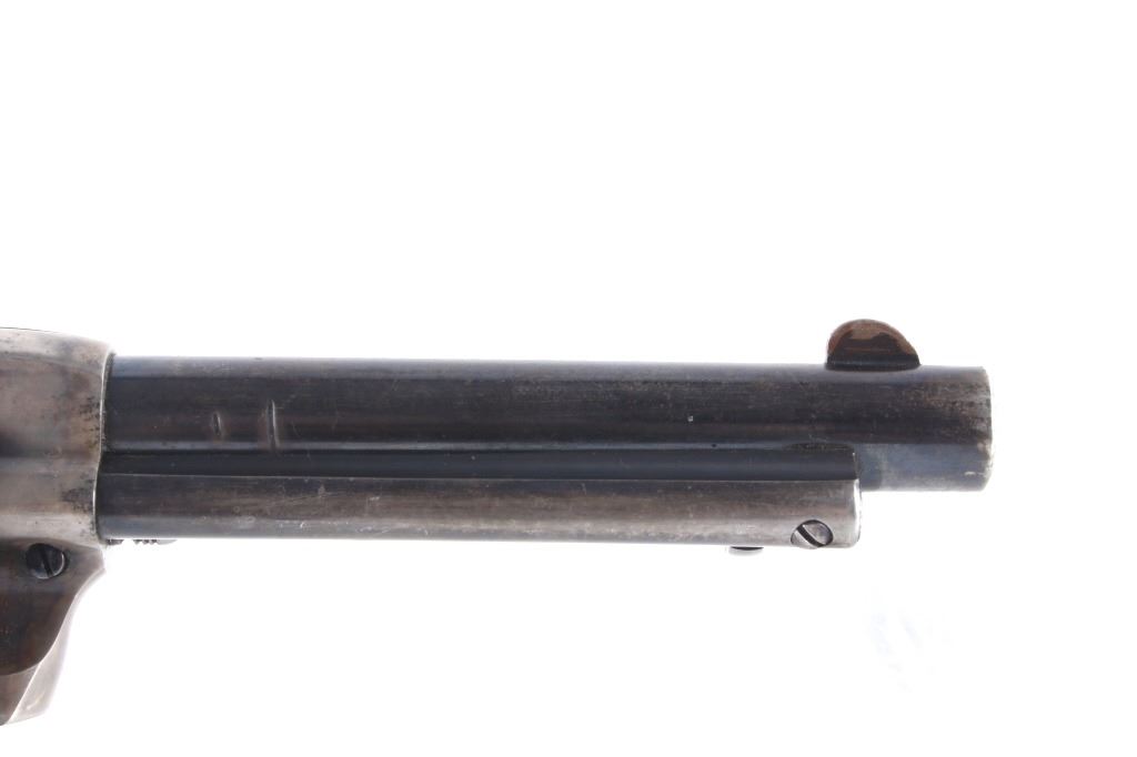 and some retain their original fire blue. The cylinder pin is also unmarred which is unusual and desirable. There is also good fire blue on the trigger sides along with good case color on much of the hammer. Also, the front sight has not been filed or altered and the bore is mirror-bright minty. The action is tight and the hammer has the correct four clicks. The included period correct style Mexican Loop holster was recently made by famed holster maker R. M. Bachman of Kalispell, Montana. It is