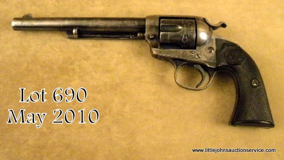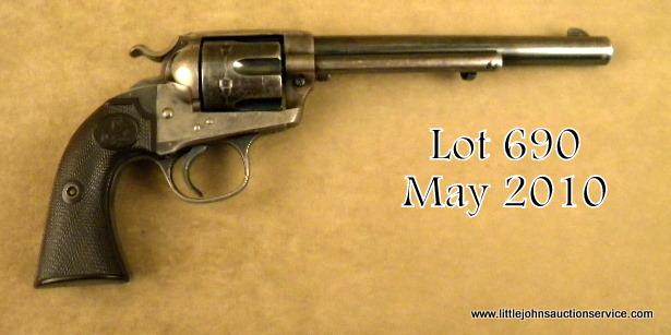 Colt Single Action, Bisley model revolver, 7-1/2" barrel, .32-20 caliber, blue and case hardened finish, hardrubber grips, serial #314911. The revolver remains in original very good plus to near fine condition showing approx. 50-70%original blue drifting on high points and edges, with some scratching, erosion, pinprick pitting, normal aging. The frame shows 60-80% case hardening drifting to a silvery grey with some areas of strong and bright rainbow colors, butpleasing colors cover the frame, though going light. The backstrap and trigger guard show 50% thinning blue. The trigger, small parts, and screws, show some bright blue. The hammer shows most of its case hardening, just starting todrift. The grips are very good plus to near fine and fit impeccably. The front sight has been trimmed slightly. The action is crisp, the bore is fair to good, and shows where the rifling is still bright. All matching serial numbers andcorrect Bisley marked barrel. Est: $2,750 - $5,500