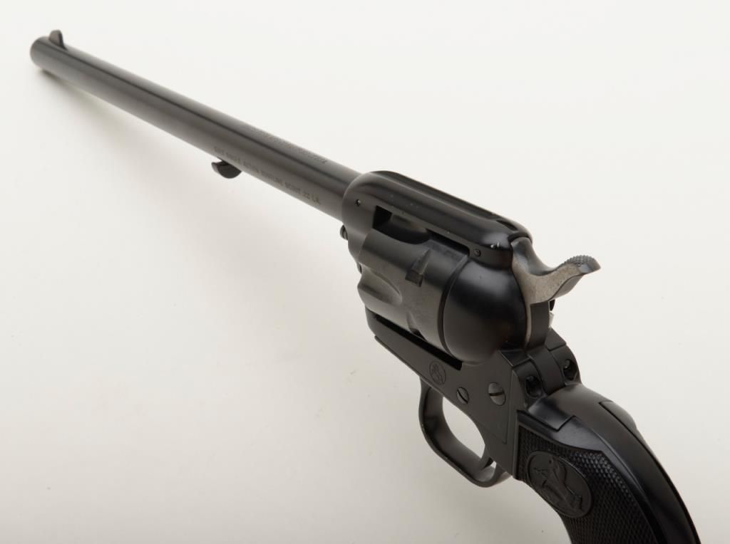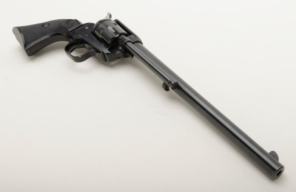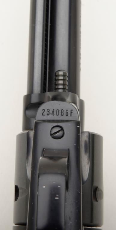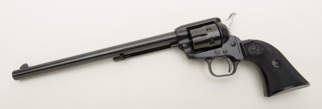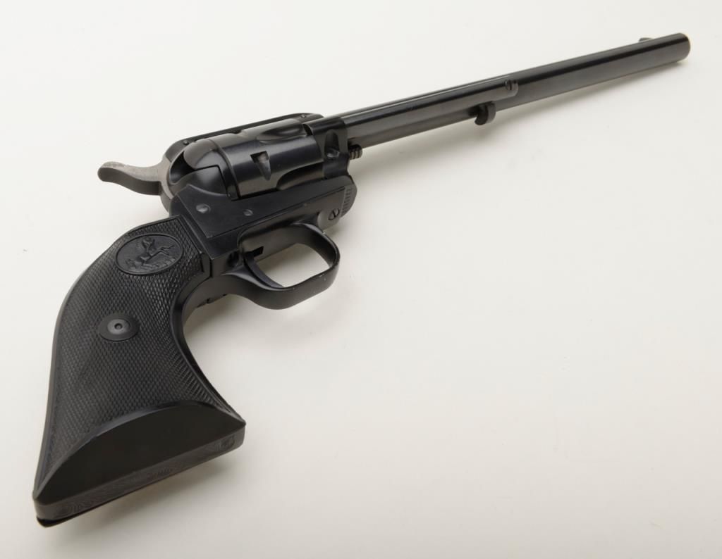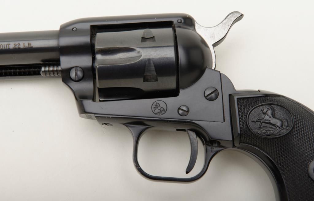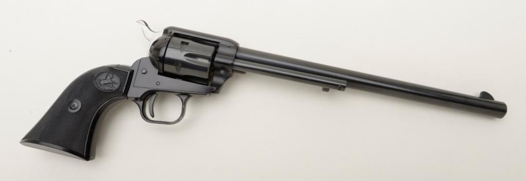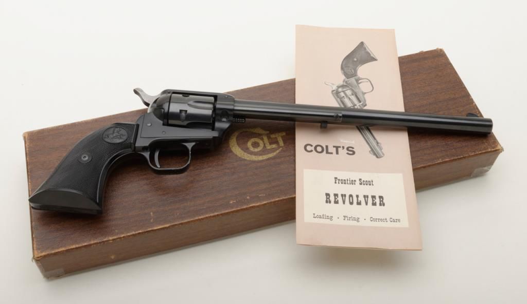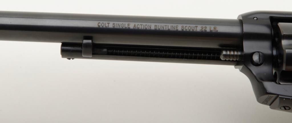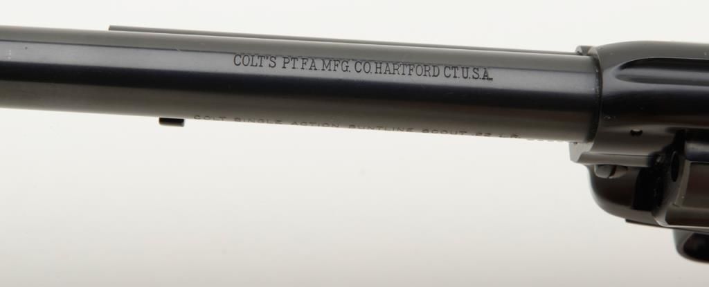 Colt Single Action Buntline Scout revolver, .22LR cal., 9-1/2” barrel, blue finish, checkered hard rubber grips, #234086F with factory two piece wood grained cardboard box numbered to this gun and with instructions and cleaning brush. This gun is in like new condition showing little handling, just a few nicks on the trigger guard. Est.: $500-$1,000.