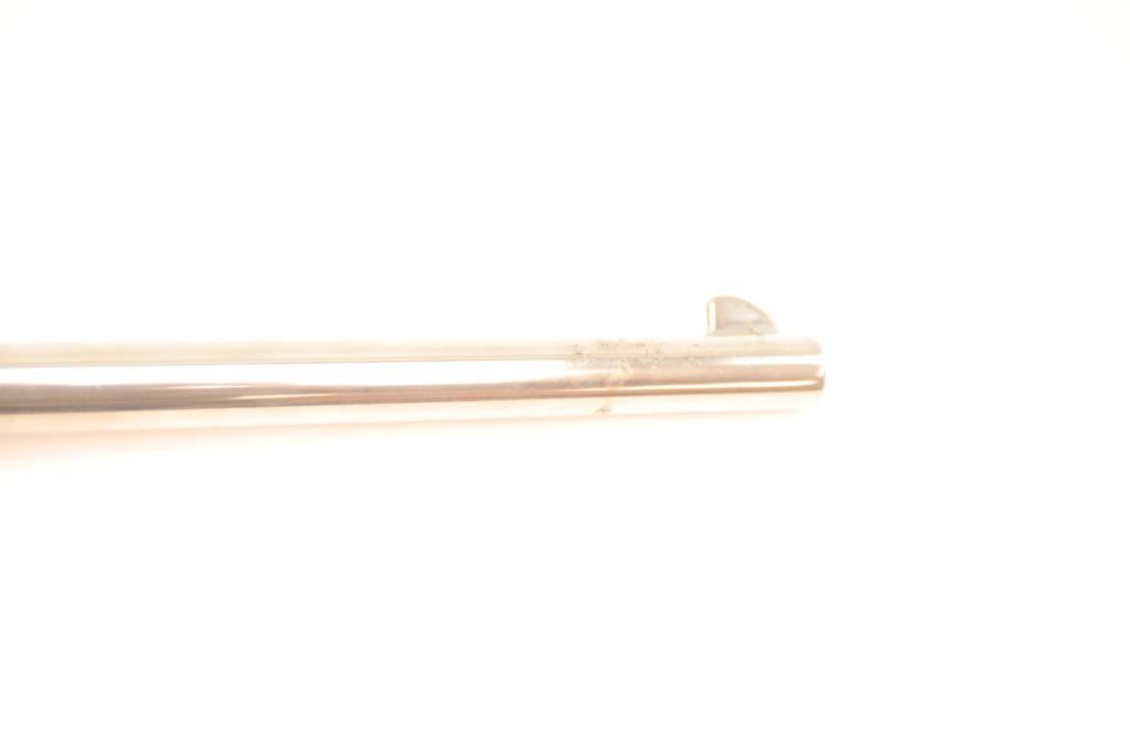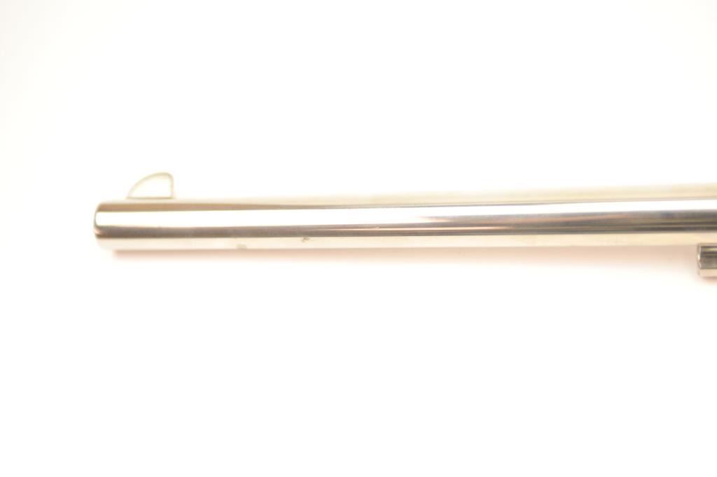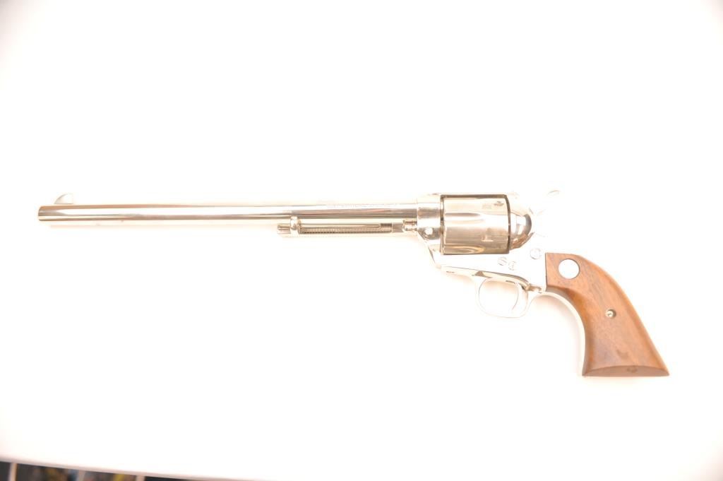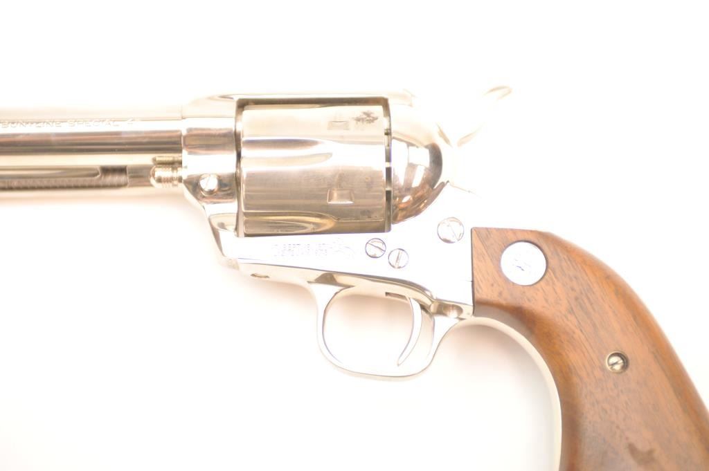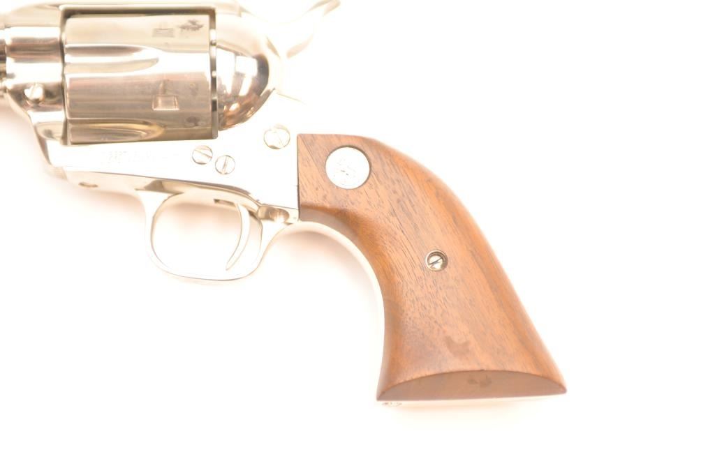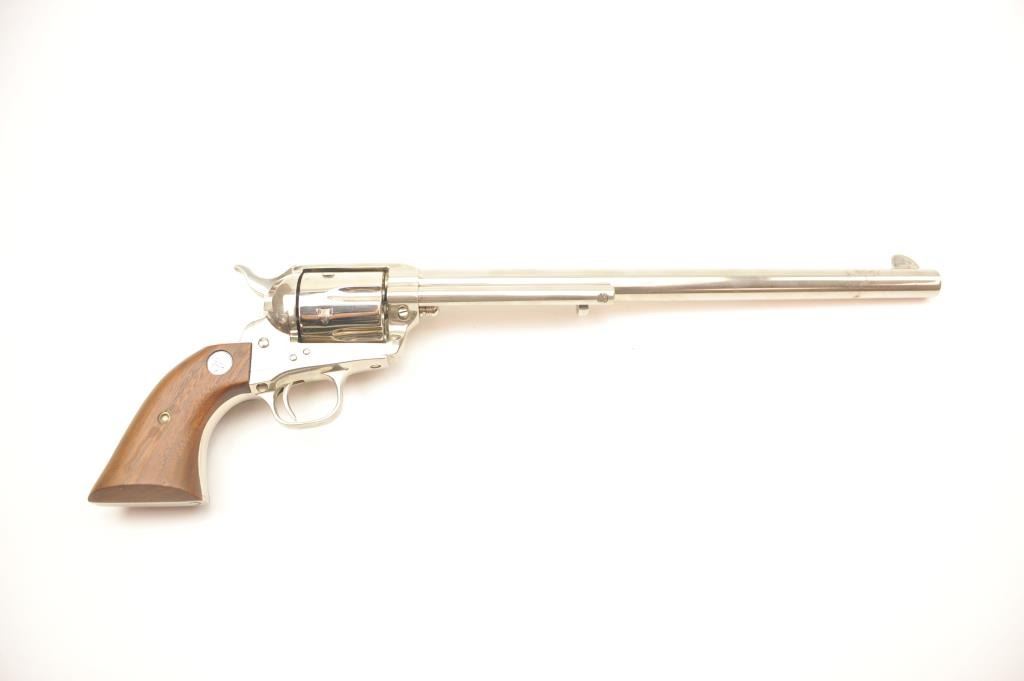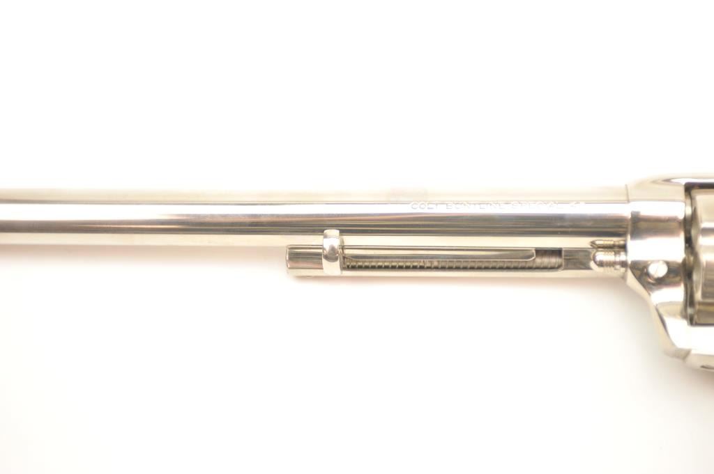 Colt Single Action Buntline Special .45 caliber revolver with a 12” barrel, factory nickel plated, medallion wood grips, Serial #SA91054, 3rd Generation. The pistol shows 95% plus original nickel with some spotting,evidence of firing, scratches and small areas of surface rust that may well clean. The action is crisp and the interior is excellent with only minor firing and light use. The grips show a couple of dings and mars. Est.: $1,000-$2,000. (Modern).