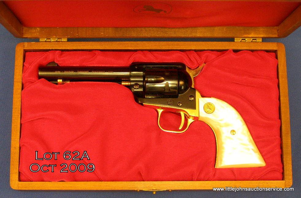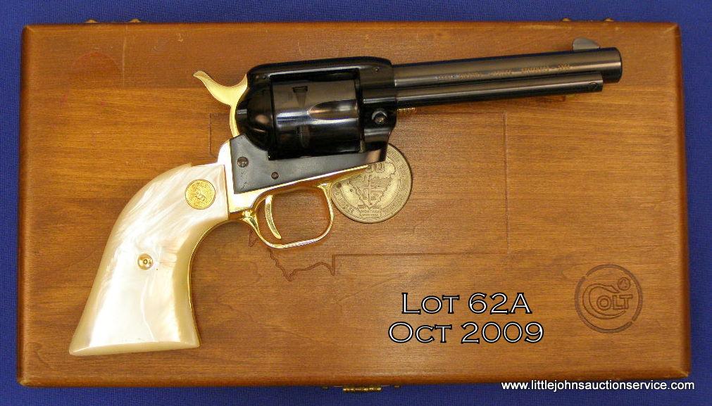 Colt Single Action Frontier Scout Commemorative Montana Territory Centennial (1864-1964) revolver, blue with gold accents, faux pearl medallion grips, #1445MF. This gun is in overall excellent condition showing approx. 99% original finish andonly a slight cylinder drag line; with correct Colt Commemorative wood box in overall very good condition with some scattered nicks and mars to finish, very good interior. Est.: $300-$500.