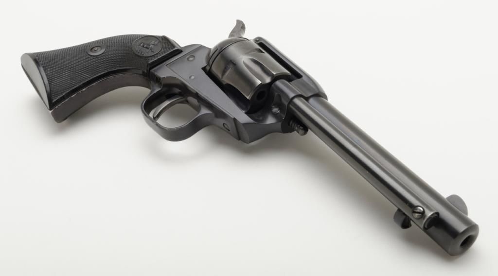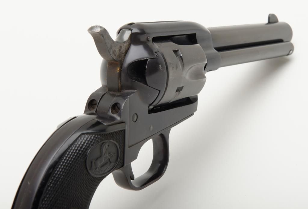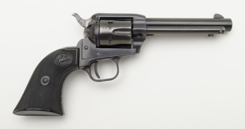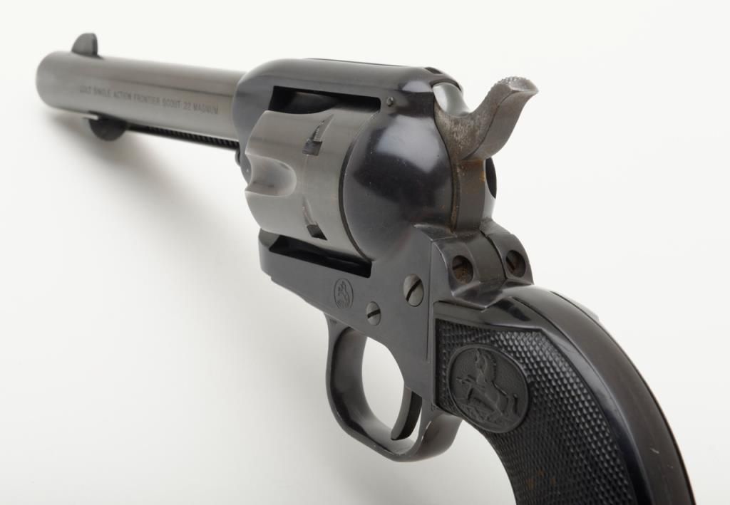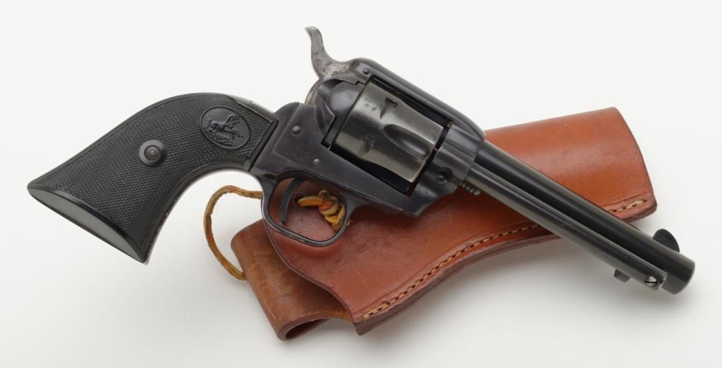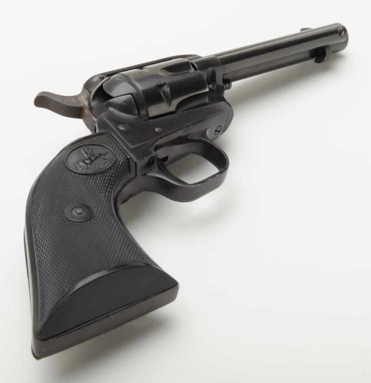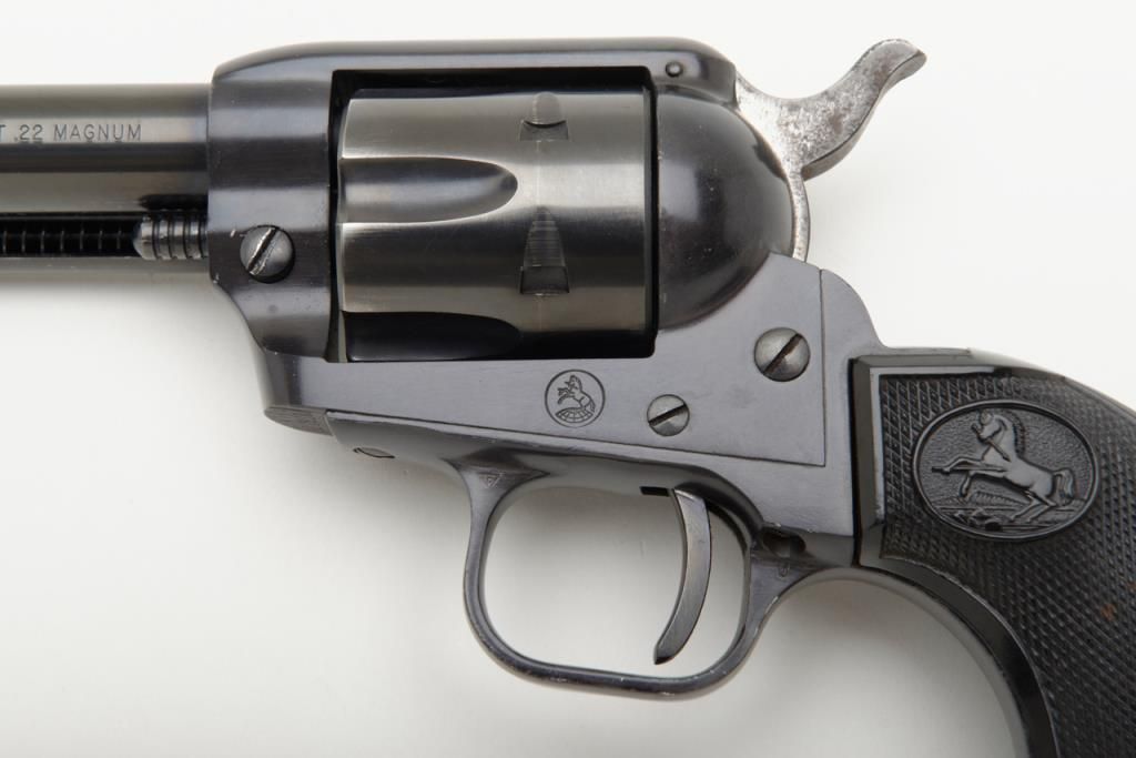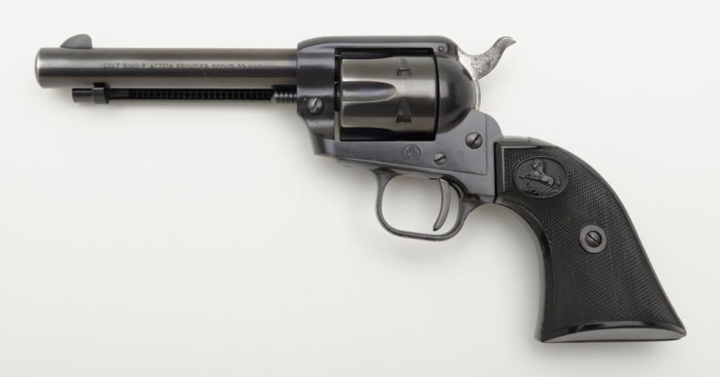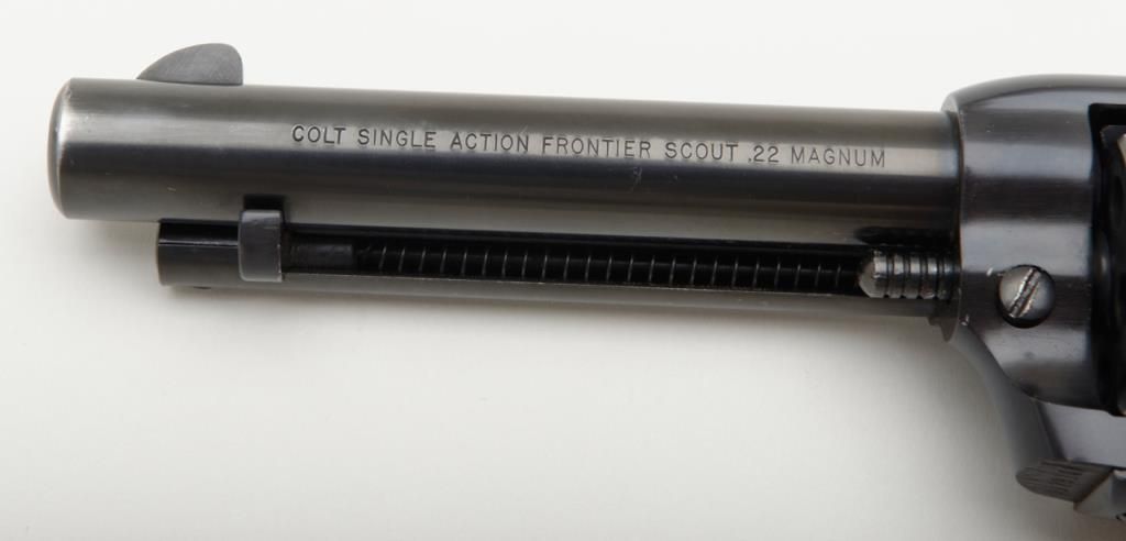 Colt Single Action Frontier Scout in .22 Magnum caliber remaining in near fine condition, serial number 112918F. The revolver shows 95% to 98% plus original blue showing some slight losses at the muzzle with a very faint index line on cylinder and some slight discoloration on the sides of the hammer. The grips are fine to excellent and the interior shows just a slight amount of use. Est.: $225-$450