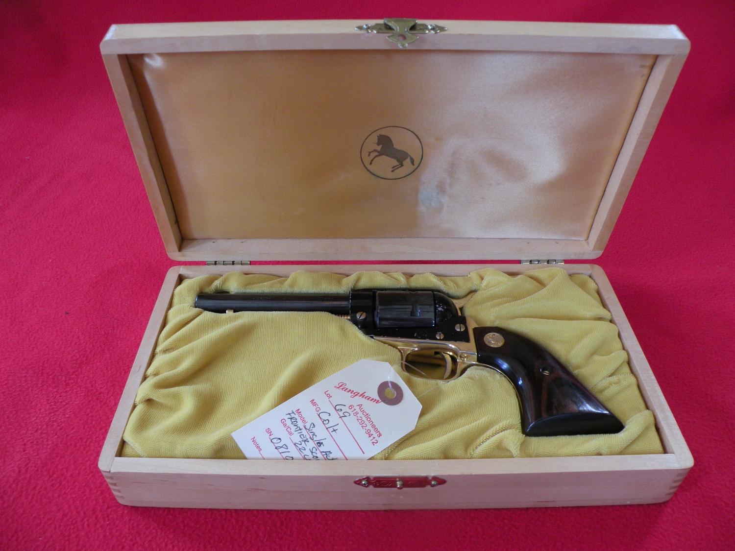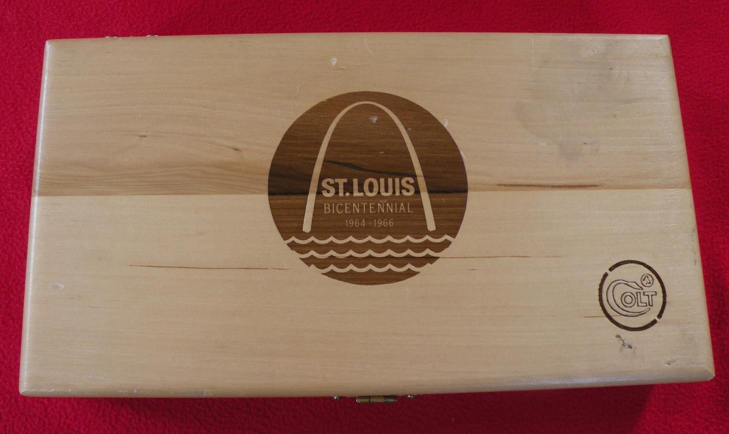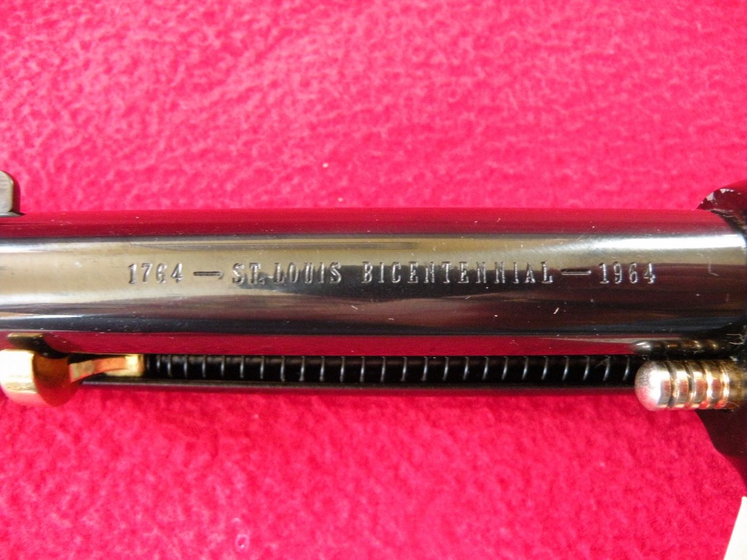 22 LR, 4 3/4" barrel, gold trigger housing, hammer, ejector rod, St. Louis Bicentennial with wooden presentation case, SN 081056