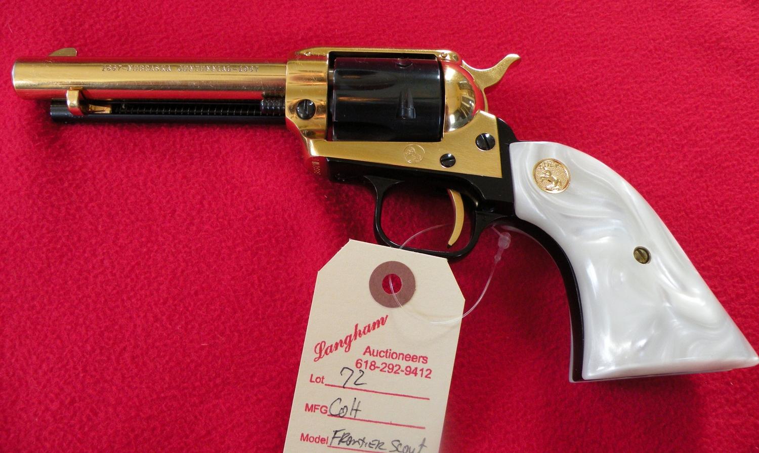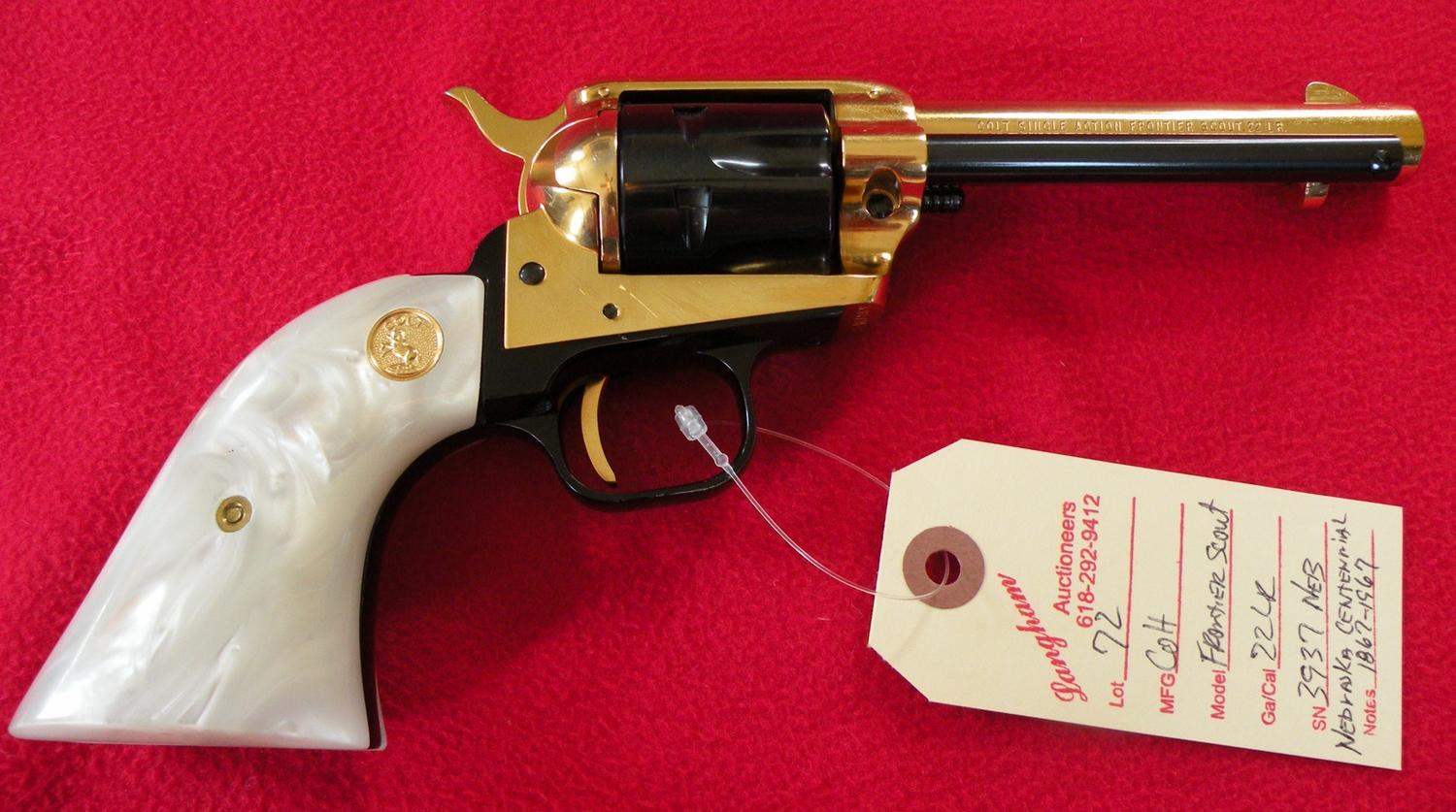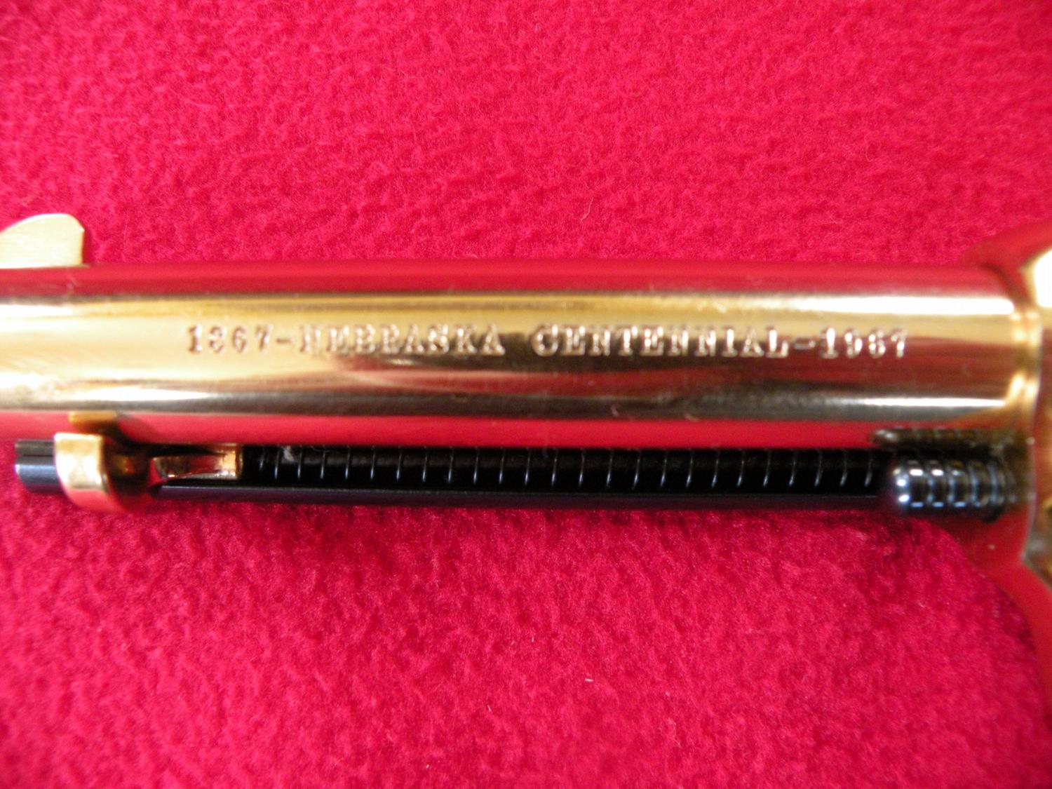 22 LR, Nebraska Centennial 1867-1967, 4 1/2" barrel, gold barrel, frame hammer and trigger, pearl grips, striking pistol, SN 3937 NEB