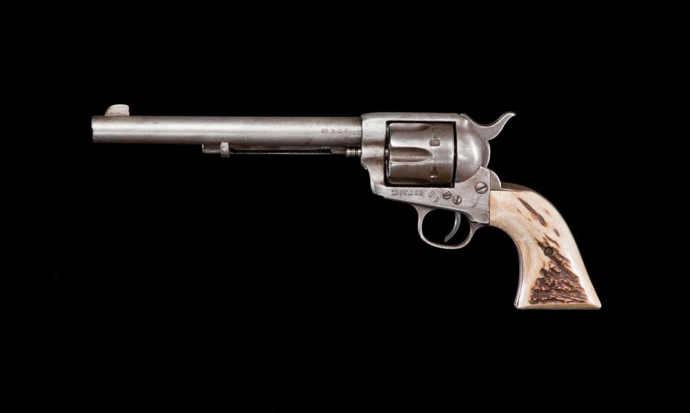 Nice gray cowboy gun, .38 W.C.F., 7 1/2”, serial #153064, circa 1893. Excellent 2-piece stag grips, action needs work and trigger has been replaced.