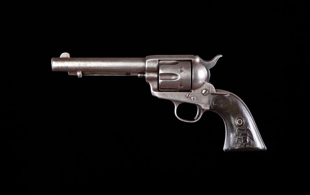 Smooth silver gray revolver in .45LC caliber, 5 1/2” barrel, and 2-piece “eagle” grips. Serial #126625. Shows nice even wear and is mechanically excellent.