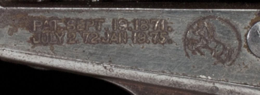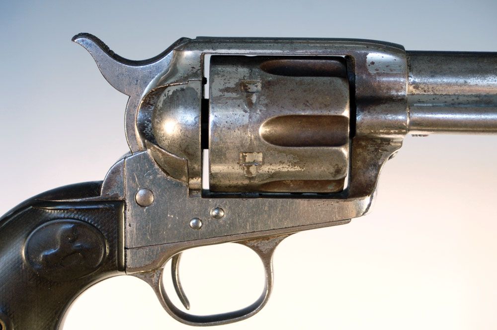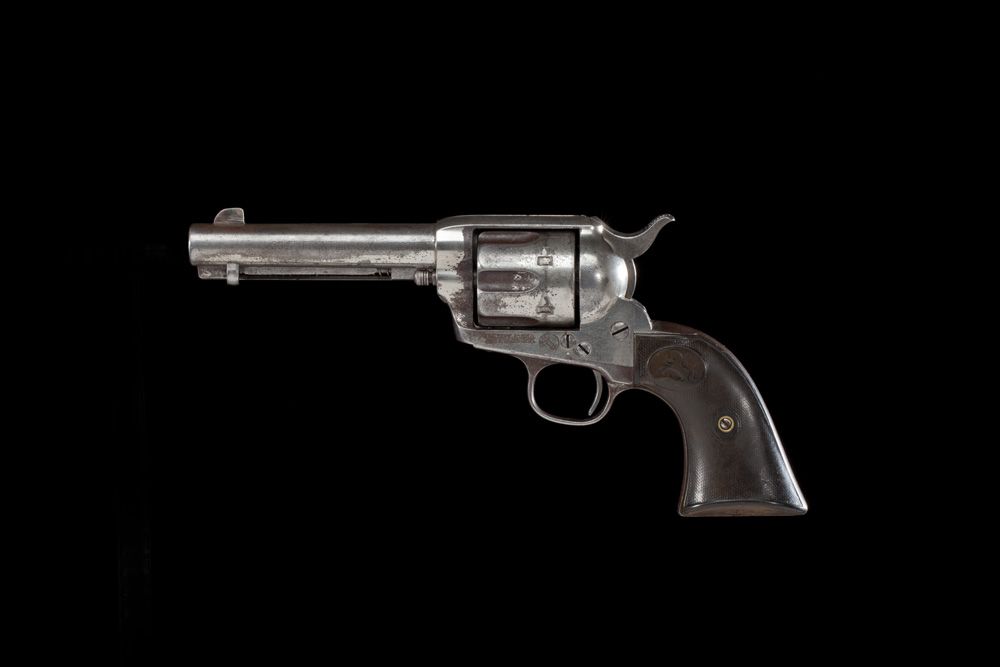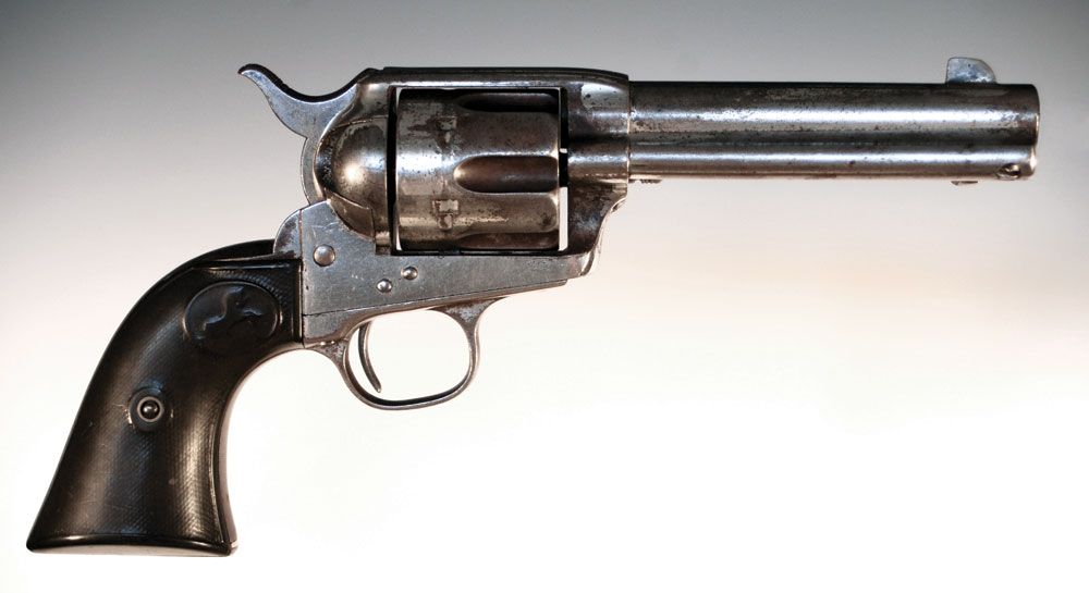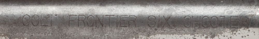 “Frontier Six-Shooter” .44-40 caliber, 4 3/4”, nickel. Factory letter, shipped to Folsom Arms 1891. Serial #143063. Remnants of nickel on the barrel and ejector housing, 75% on frame and traces on other parts. Sharp clear markings, smooth hard rubber grips, all original.