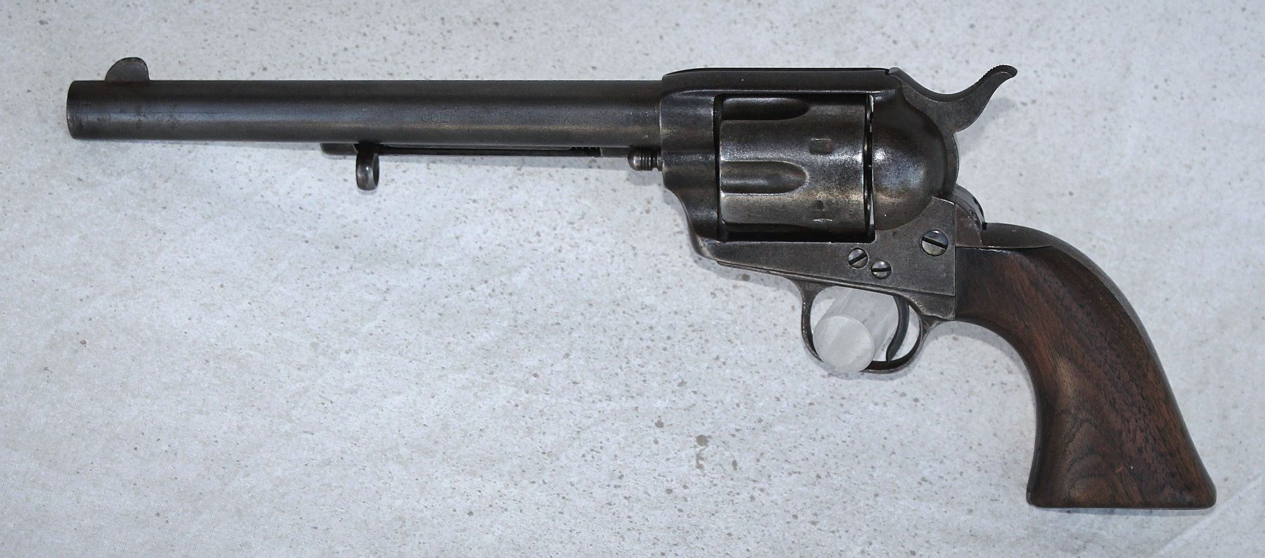 A scarce 7 1/2" "Colt Frontier Six Shooter", with roll dyed barrel, attractive mellow finish, walnut grips and all matching numbers. Ser. #67xxx. Antique.