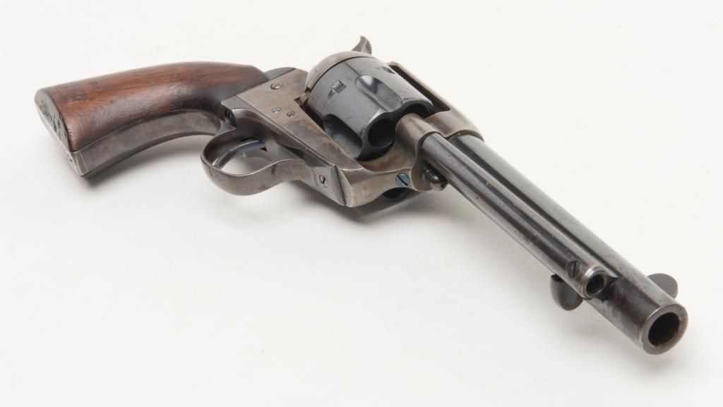 Colt Single Action, U.S. issued Artillery series, .45 caliber revolver with 5 ½” barrel showing full military inspections with U.S. marked frame, serial number 42150. The barrel is an artillery replacement barrel with “Renaldo A. Carr”inspection and “P” proof. The frame shows early three line patent dates and U.S. from early series cavalry. The cylinder shows “R.A.C.” on the back and also probably an arsenal replacement with the barrel. The trigger guard is stamped 119633 withno inspection and the back strap is number 120763 also not showing inspection. The grips show a 1903 cartouche on the right side with large “R.A.C.” and also are “R.A.C.” stamped on the bottom of each grip. The ejector rod housing is an earlymilitary type with correct rod and spring. This artillery remains in near fine original condition with 90% to 95% bright blue on the barrel showing a few minor storage marks and some minimal beginning age. The ejector Rod housing shows85%-95% blue with some slight wear at the edges. The cylinder shows 90%-95% bright original blue with minor scratches and normal aging. The frame shows 75%-85% original case hardened colors that are drifting slightly on the left and very good