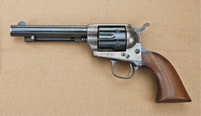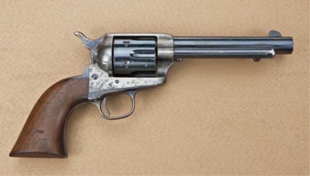 Colt Single Action army revolver, US artillery series, 5-1/2” barrel, blue and case hardened finish, cartouche wood grips, in near fine original condition, frame #10116. The triggerguard is #94763 with a “G” inspection. The backstrap is numbered 115810. The barrel is a replacement with .45 Colt stamped on left side, and cylinder shows “RAC” on back, also replaced at time of refurbishing by Colt factory. Revolver shows an early blackpowder style ejector rod housing. With correct ejector rod and spring. The barrel shows 90-95% bright original blue, some slight wear at the muzzle, some minor scratches, the ejector rod housing is perfectly factory fit and shows 80% blue thinning at the edge and front. The factory replacement cylinder show 90% bright original blue with some minor scratches, wear at the front and edges. The frame shows 30-50% case hardening drifting to silvery grey with some faint colors mostly showing at the front of the frame. The backstrap and triggerguard show 60% blue that is still very vivid. The factory replacement hammer shows 90% case hardening. The wood grips fit perfectly and are in near fine condition with cartouche and 1903 date on right and small RAC