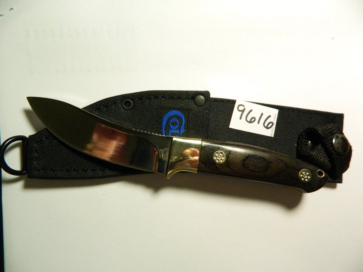 Skinner - 8 1/4" overall. 3 3/4" stainless upswept skinner blade. Black wood handles. Full tang. Nickel silver finger guard. Lanyard hole. Black nylon belt sheath.