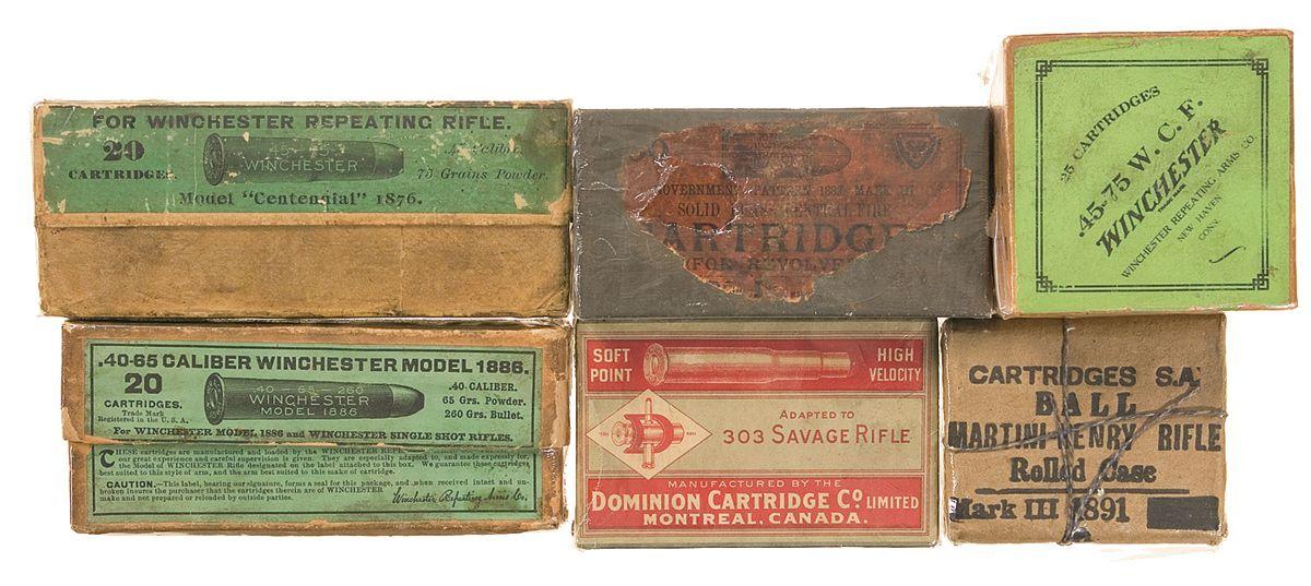 Produced in 1900, standard markings and features, refinished wood (smooth and repaired forearm), chip absent on buttplate. Sealed package of cartridges marked "CARTRIDGES S.A. / BALL / MARTINI HENRY RIFLE / Rolled Case / Mark III 1891", square box of Winchester .45-75 WCF cartridges, box of Winchester .40-65 cartridges for Model 1886, box of Winchester .45 WCF cartridges for Model 1876, box of Dominion .303 Savage rifle cartridges, and empty box of Eley .476 cartridges (most of the label is missing). All in protective wrapping.