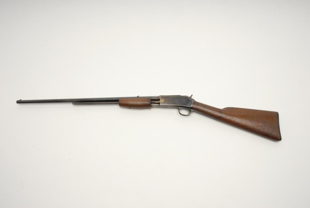 Colt Small Frame Lightning pump action magazine rifle in .22 caliber, S/N 65505 with octagon barrel. 50%-60% original blue thinning on the edges, with very good wood, good markings, and good action. Original butt plate intact. Goodaction and good bore that may clean to very good or better. (C&R) Est.: $600-$1200