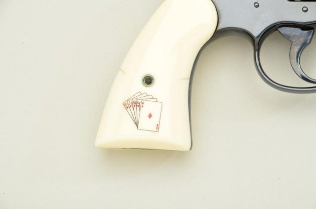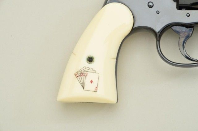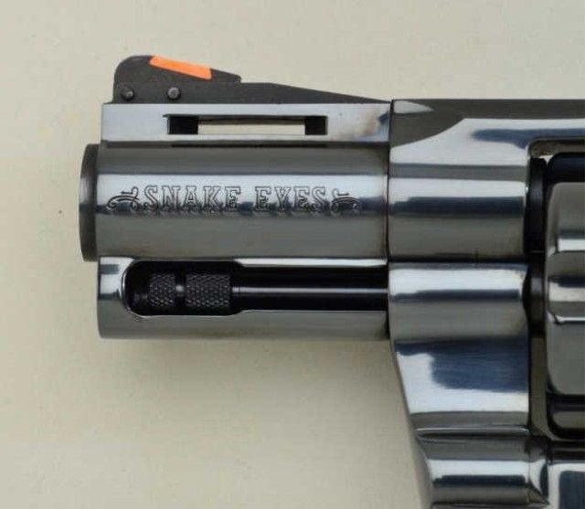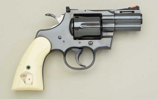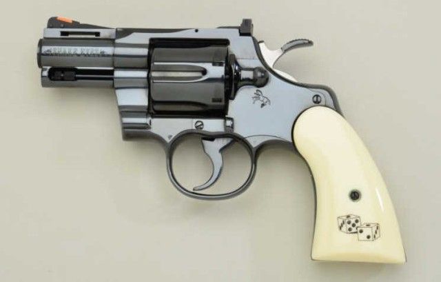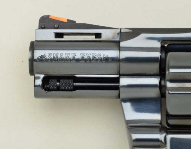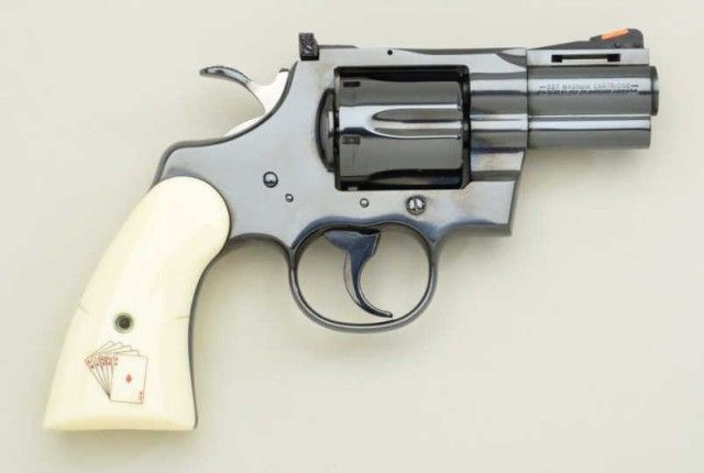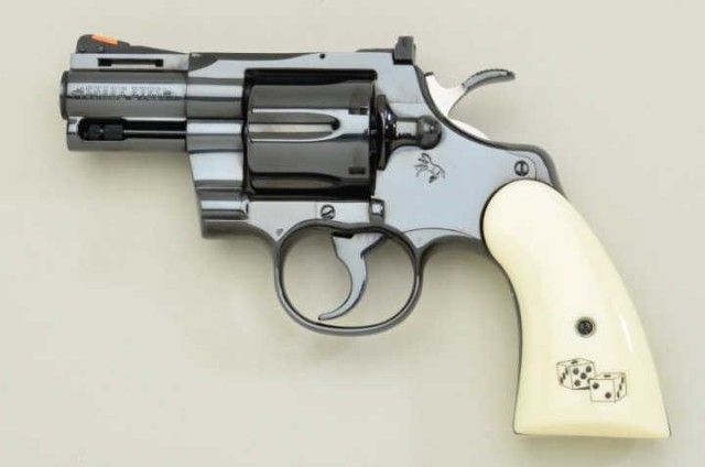 Colt Snake eyes 357 magnum double action revolver 2-1/2" barrel blued finish, factory composite grips with dice on left, royal flush on right serial #EYES370 identical in design to Colt Python. Formerly Colt factorycollection sold by Butterfields with their tag attached. Fine to excellent in box, shows some slight use 98-99%. Note: See prior lot for matching number. Robert E. Petersen collection. Est.;$900-$1,800.