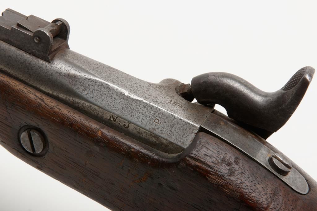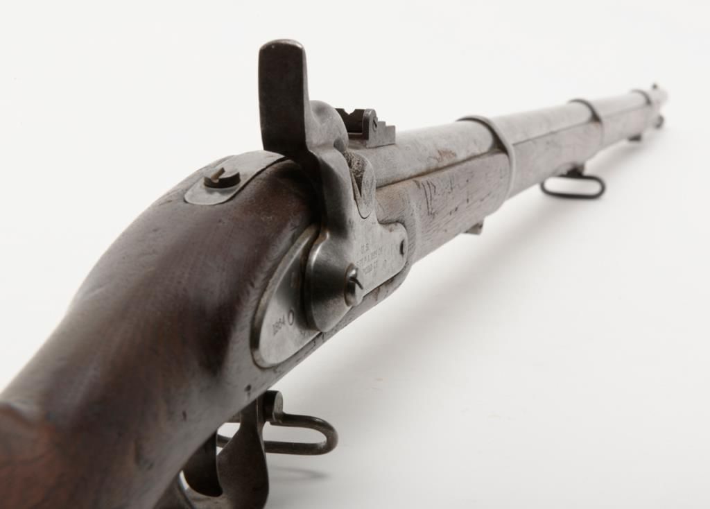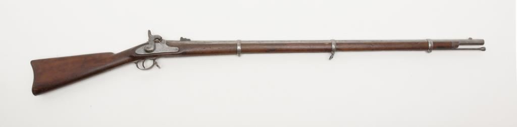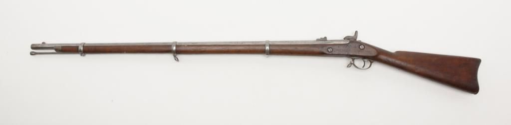 Colt Special Model rifled musket dated 1864 on the lock with New Jersey State markings on the breech remaining in good original condition. The lock markings and Eagle on bolster are clear and fairly sharp with 1862 on the breech of the barrel and P proofed. The metal surfaces show some of their original bright going to light patina with some scattered minor pitting and erosion. The stock is good showing dings, mars, scratches and a couple of dents with a few minor losses along the ramrodchannel. The original to the period ramrod, sights and swivels are all retained. The action works well and bore is fair to good with shallow but good rifling. William A. Gary collection consigned by his estate. Est.: $900-$1800