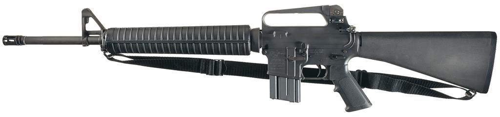 Produced after 1994. Adjustable post front and 2-aperture peep rear sights, with a bird cage flash hider on the 1/7 inch twist heavy barrel, ribbed forearm, standard lower receiver markings, checkered pistol grip and a fixed buttstock.