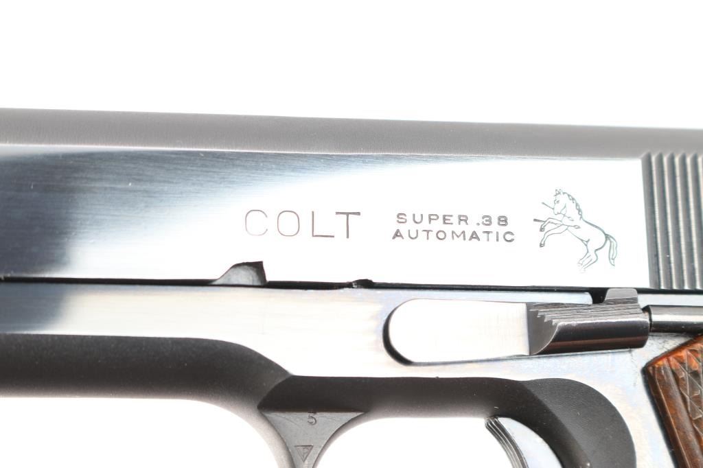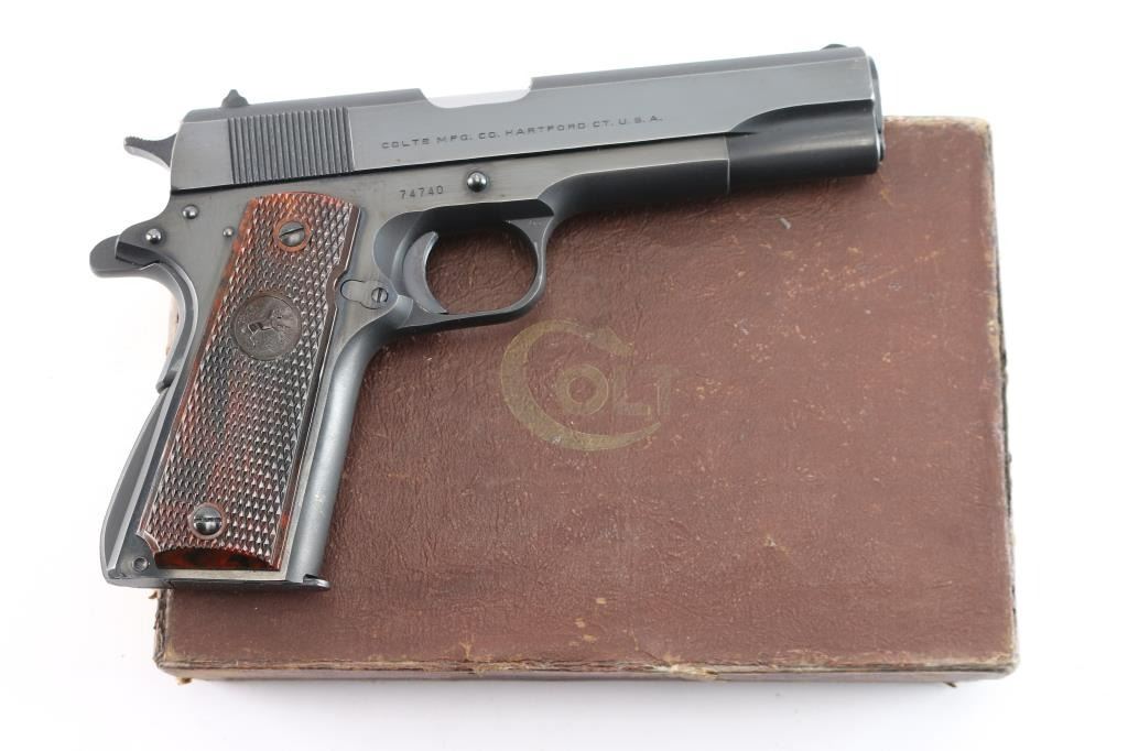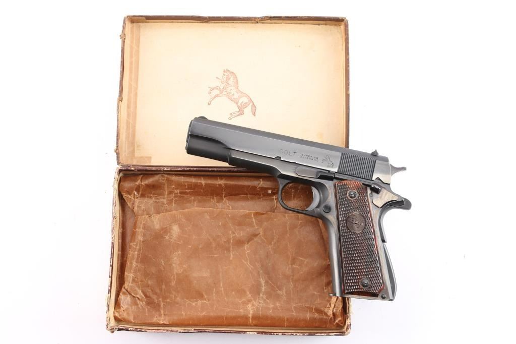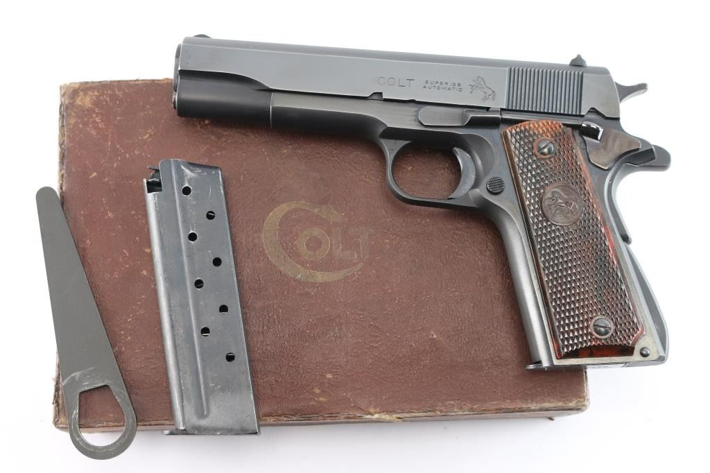 ‘Fat Barrel’ 1911A1 pattern single action semi-automatic pistol chambered in .38 Super. Manufactured in Hartford, CT circa 1949. Features a matte blued finish with polished flats, 5" ‘fat’ barrel, low-profile serrated ramp front sight, dovetailed square notch rear sight, serrated curved trigger, serrated hammer spur, thumb safety on the left side of the frame, grip safety, push button magazine release, factory 9 round magazine, steel frame, serrated arched mainspring housing, checkered ‘Coltwood’ faux wood synthetic grips with embossed Colt logo. Includes the original factory one-piece brown cardboard box with gold end label, spare magazine, barrel wrench, Colt patch, and reprinted documents. Pistol retains approximately 98% of its original blued finish showing minor edge wear and a couple miniscule spots of light rust on the right side of the flats. The action is mechanically sound, the bore is excellent/bright, and the Coltwood grips are excellent.