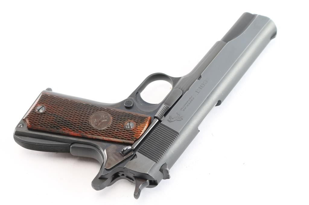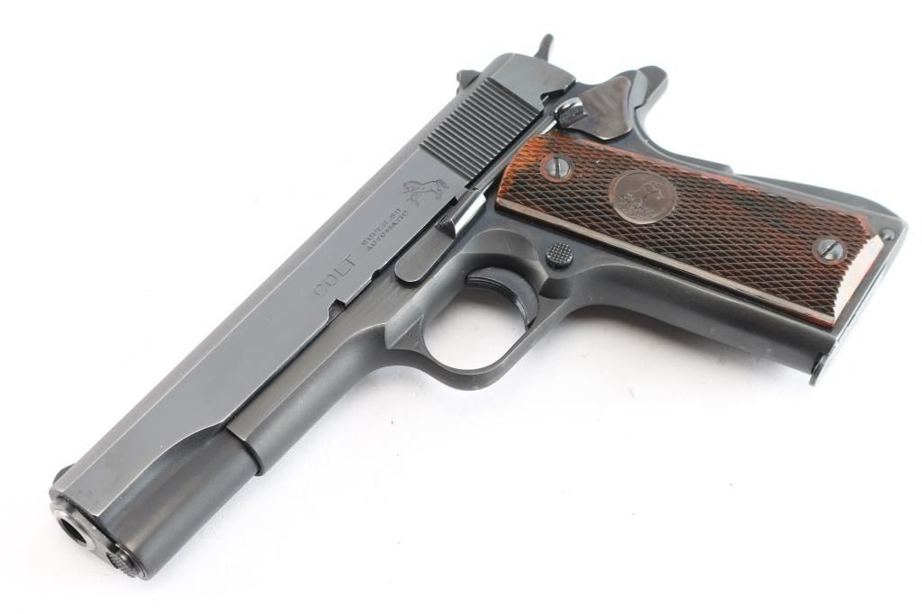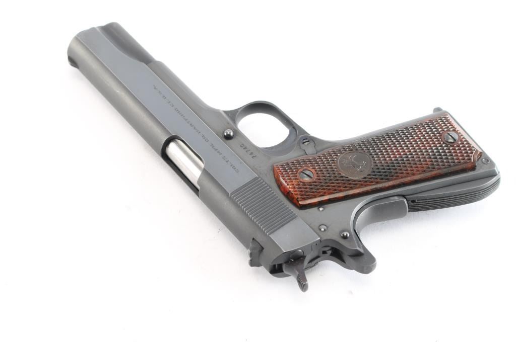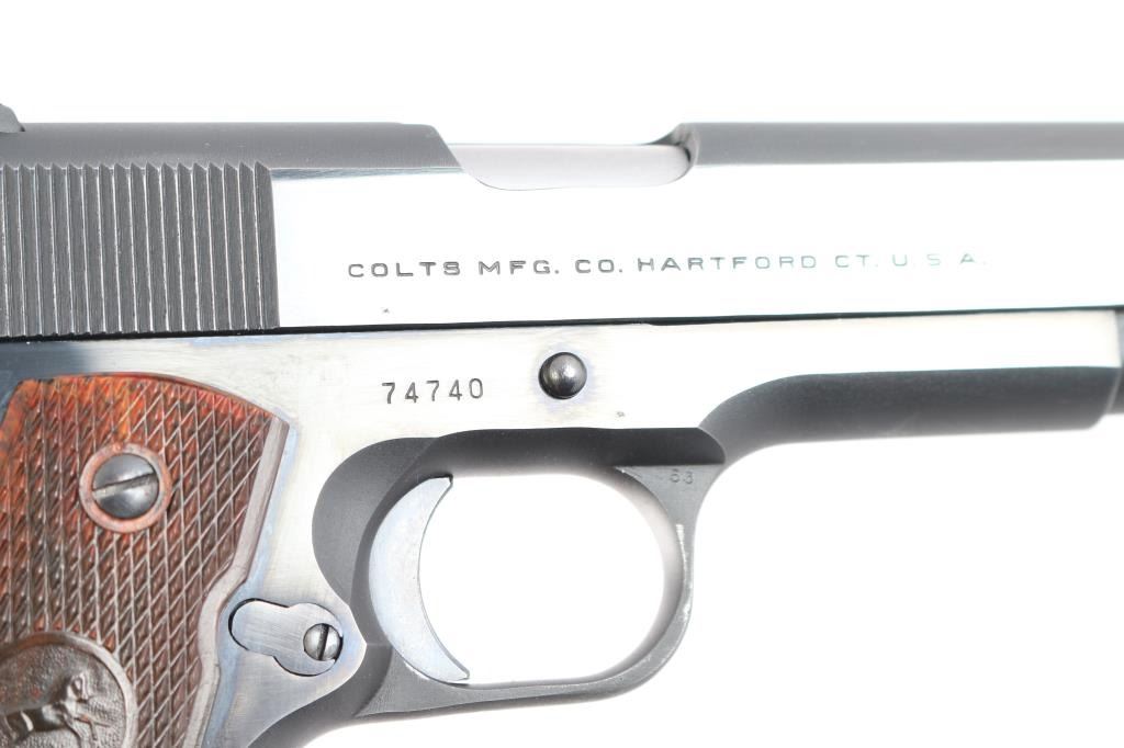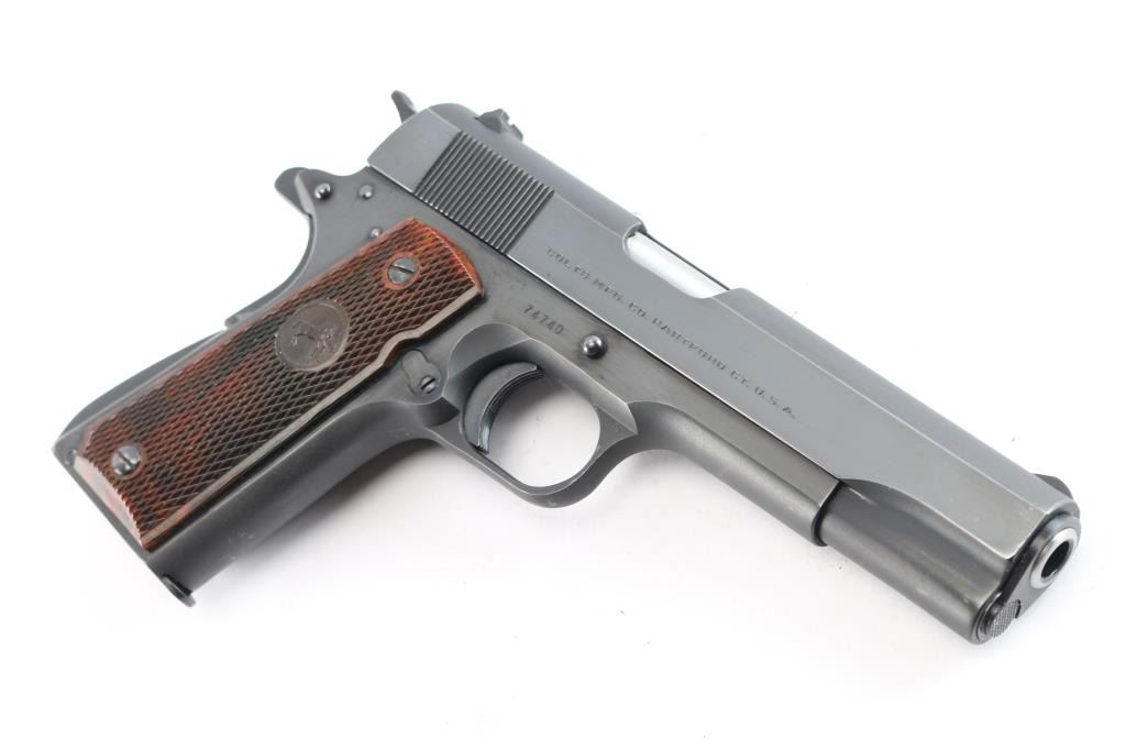 ‘Fat Barrel’ 1911A1 pattern single action semi-automatic pistol chambered in .38 Super. Manufactured in Hartford, CT circa 1949. Features a matte blued finish with polished flats, 5" ‘fat’ barrel, low-profile serrated ramp front sight, dovetailed square notch rear sight, serrated curved trigger, serrated hammer spur, thumb safety on the left side of the frame, grip safety, push button magazine release, factory 9 round magazine, steel frame, serrated arched mainspring housing, checkered ‘Coltwood’ faux wood synthetic grips with embossed Colt logo. Includes the original factory one-piece brown cardboard box with gold end label, spare magazine, barrel wrench, Colt patch, and reprinted documents. Pistol retains approximately 98% of its original blued finish showing minor edge wear and a couple miniscule spots of light rust on the right side of the flats. The action is mechanically sound, the bore is excellent/bright, and the Coltwood grips are excellent.