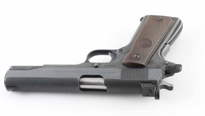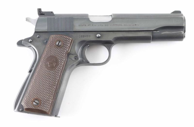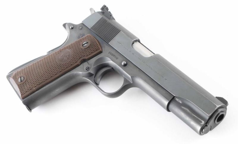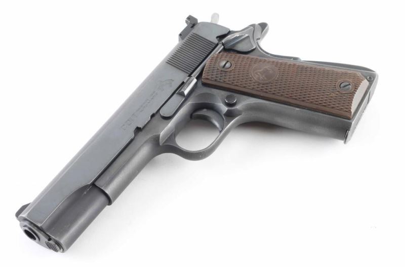 1911A1 pattern single action semi-automatic pistol manufactured circa 1964. Features matte blued finish with polished blue on flats, 5" barrel, serrated ramp front sight, adjustable rear sight, grooved trigger, serrated spur hammer with polished sides, thumb safety on the left side of the frame, grip safety, push button magazine release, steel frame, serrated arched mainspring housing, checkered brown plastic grips with Colt emblems. Bore is very good condition. Retains 85% finish with scratches and scrapes, edge losses, finish turning a bit gray on grip straps & grip safety. Grips are very good condition. Includes (1) magazine. Condition is NRA Very Good+ *** C&R Firearm ***