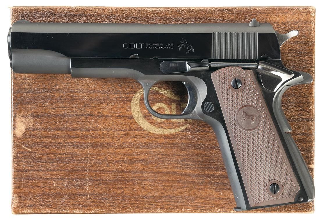 Manufactured in 1968. Fixed sights, with the Hartford address on the right side of the slide and "COLT", "SUPER .38/AUTOMATIC" on the left followed by the Rampant Colt. The flat surfaces have a polished blue finish and rounded surfaces are matte blue. Standard features with checkered brown grips. Complete with the original factory box numbered to the gun.