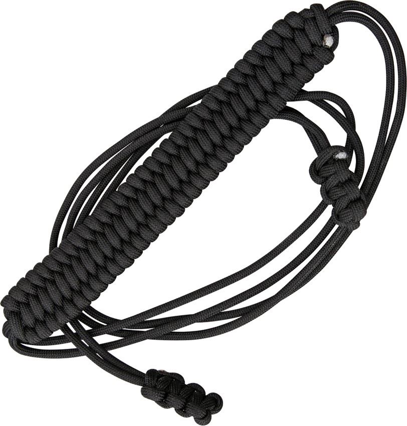 Use: launching rocks at targets. Black braided paracord construction.