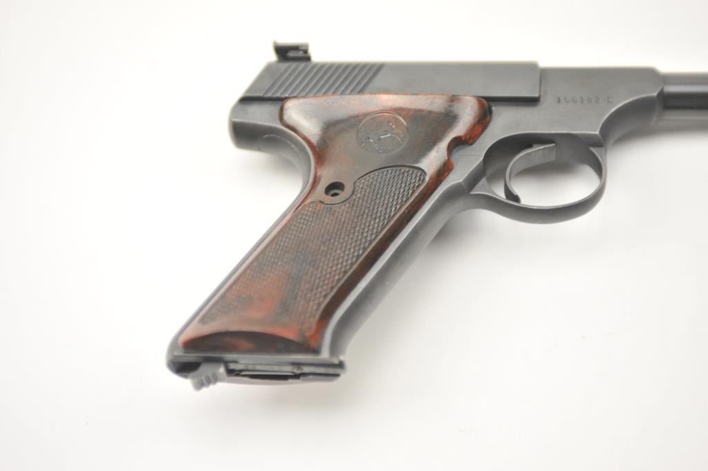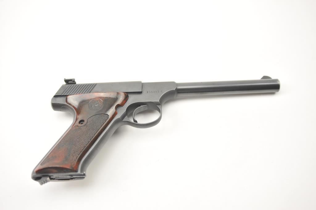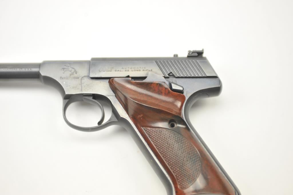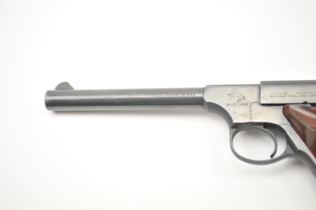 Colt Targetsman Semi-automatic pistol, .22 Long Rifle caliber, Serial #156182-C. The pistol is in fine overall condition with a 6” barrel. The pistol retains approximately 93-95% with light handling marks. Thecheckered plastic grips are in very good condition missing the center screw. The bore is good, the action is crisp and the markings are sharp. The lot includes one correct magazine. Est.: $400-$800.(Modern/PPT).