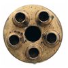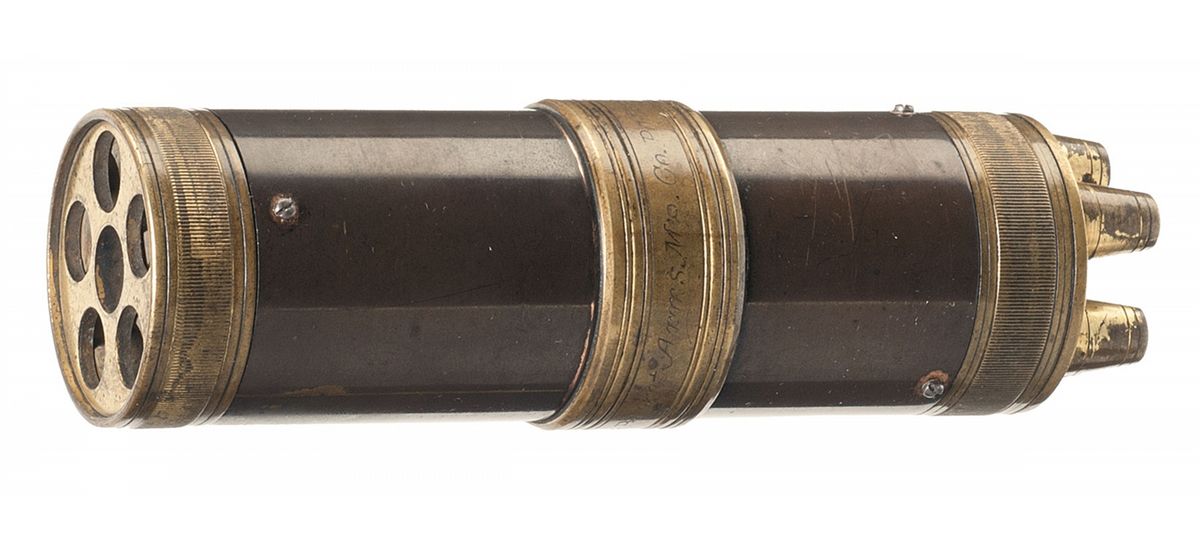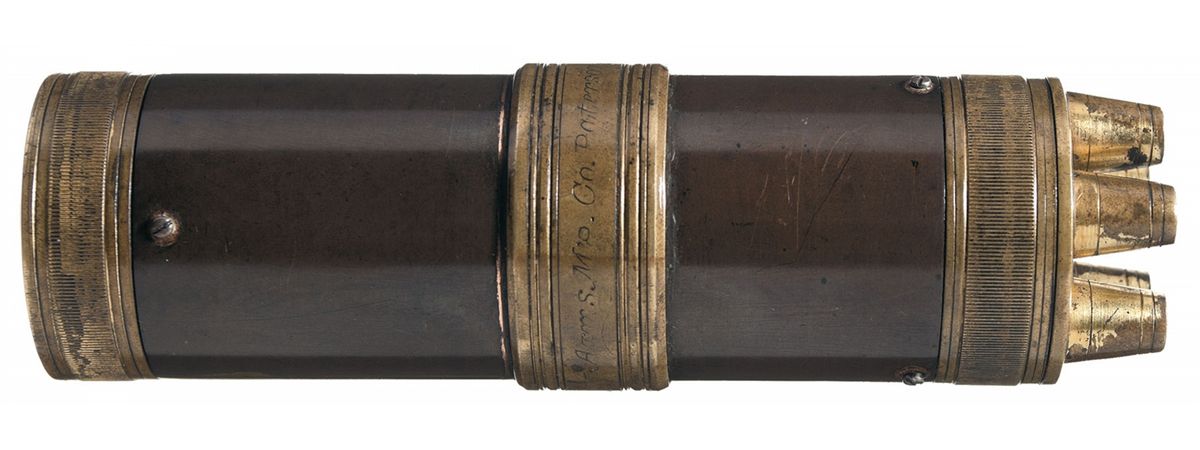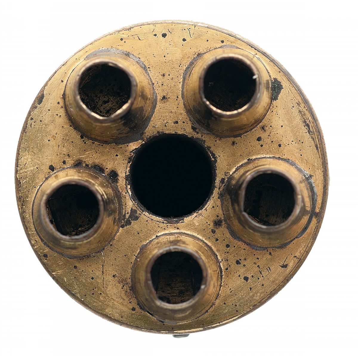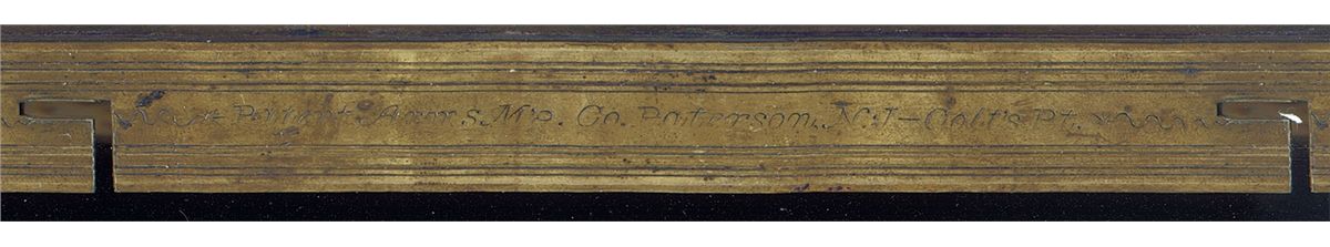 The Colt Paterson Texas Model charger is the largest of the pistol flasks. This charger is also known as the Paterson Holster charger. The center band is marked "Patent Arms M'G. Co. Paterson, N.J.-Colt's Pt." and is stamped with the number "63/9" near the top. The five chargers are tapered and have scribe lines at the mouth and base. The top and bottom turn rings are knurled and have scribed lines. The powder compartment has a simple swivel gate. The finish is polished and lacquered.
