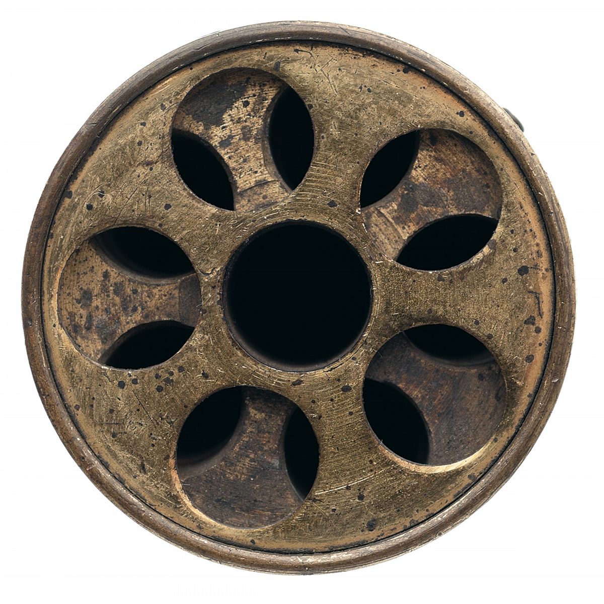 Condition: Very fine. The body retains half of the original lacquer and the remaining metal surfaces have a mixed patina. 40% of the gilt remains.