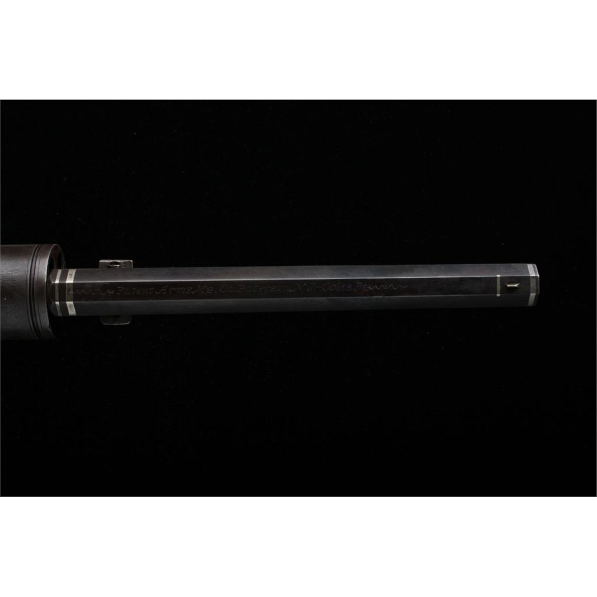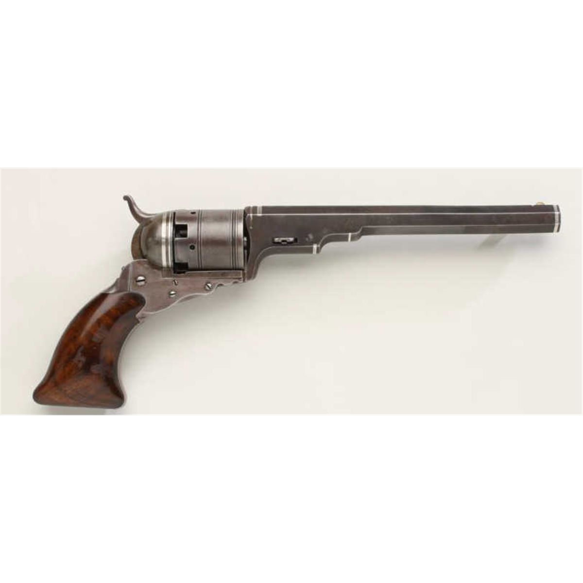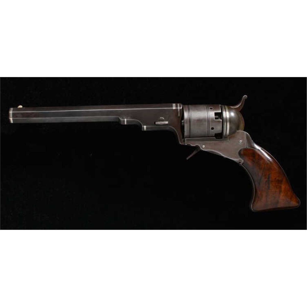 Colt Texas Paterson with rare original banded decoration and select burl walnut grips, .36 caliber percussion, 7-1/2” barrel, 5-shot, serial #69. Pictured in The Book of Colt Firearms by Sutherland and Wilson andformerly in the Robert Sutherland collection. Illustrated at the beginning of the chapter, item “A”, page 32. Decorated Colt Patersons are extremely rare with approx. 12 known engraved and less than 10 authentic bandedTexas models making them among the rarest of all Colt firearms. This Paterson shows seven bands and a plaque inlay in the backstrap for a total of eight. The most highly decorated Patersons will have seven or more, eight ornine are considered exceptionally deluxe. This Paterson, serial #69, shows all matching numbers and has been professionally restored. A letter concerning this restoration by master gunsmith H. L. Acevedo(the artisan who accomplished the work that Tom Haas Sr. supervised in his later years) is included and in summary states that he repaired the end of the barrel, restored the barrel address, and rerolled the cylinder. He