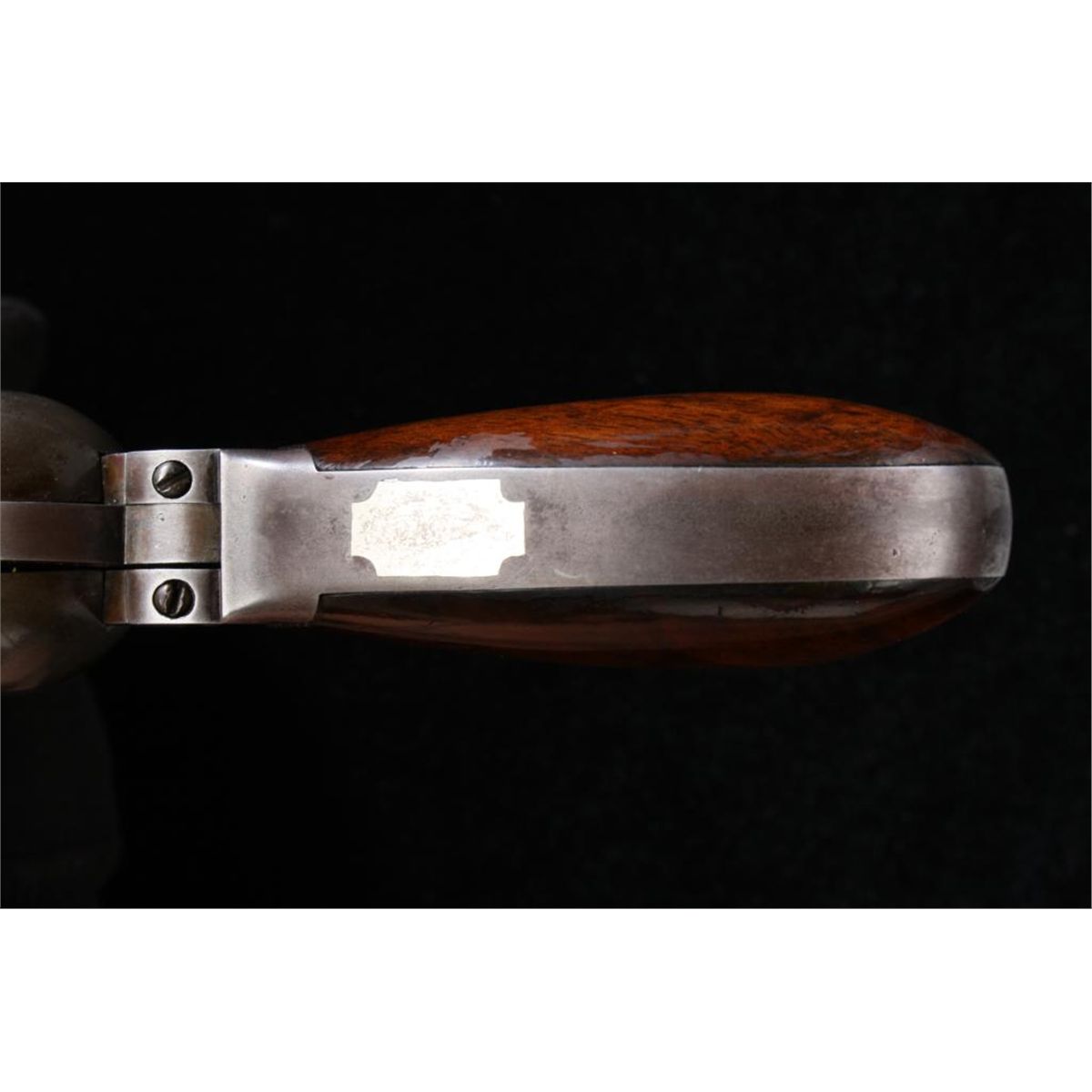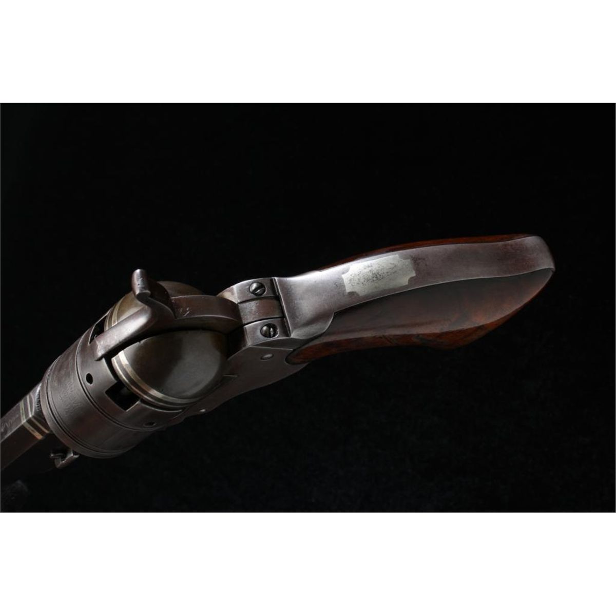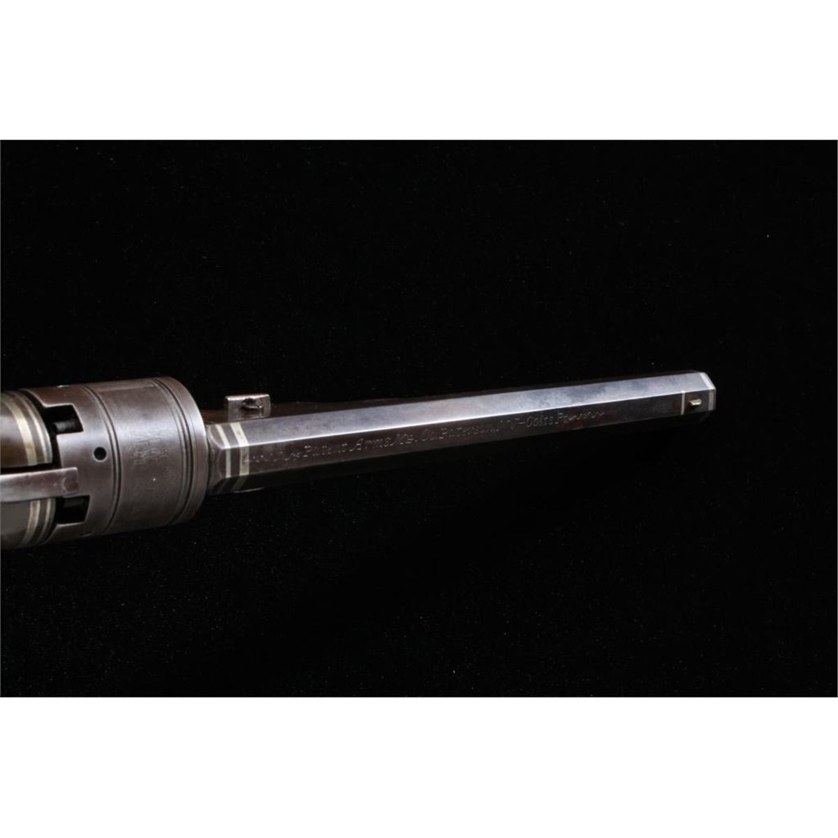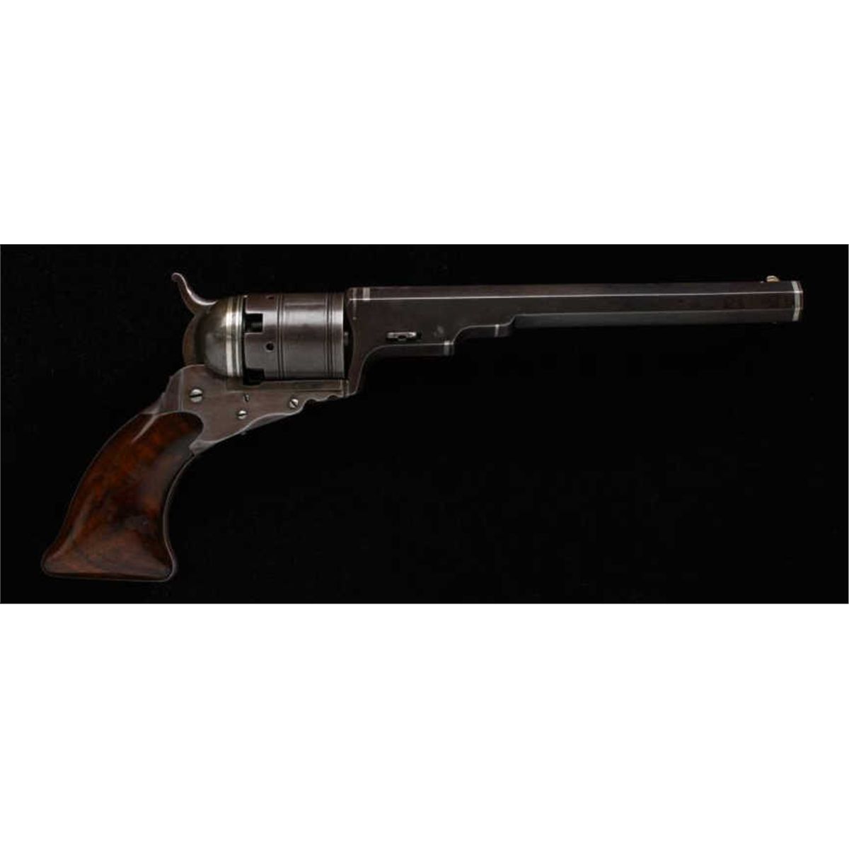 Colt Texas Paterson with rare original banded decoration and select burl walnut grips, .36 caliber percussion, 7-1/2” barrel, 5-shot, serial #69. Pictured in The Book of Colt Firearms by Sutherland and Wilson andformerly in the Robert Sutherland collection. Illustrated at the beginning of the chapter, item “A”, page 32. Decorated Colt Patersons are extremely rare with approx. 12 known engraved and less than 10 authentic bandedTexas models making them among the rarest of all Colt firearms. This Paterson shows seven bands and a plaque inlay in the backstrap for a total of eight. The most highly decorated Patersons will have seven or more, eight ornine are considered exceptionally deluxe. This Paterson, serial #69, shows all matching numbers and has been professionally restored. A letter concerning this restoration by master gunsmith H. L. Acevedo(the artisan who accomplished the work that Tom Haas Sr. supervised in his later years) is included and in summary states that he repaired the end of the barrel, restored the barrel address, and rerolled the cylinder. He