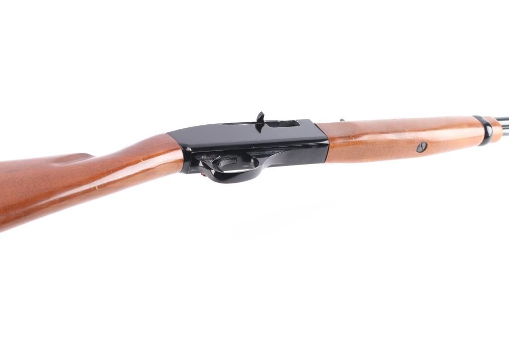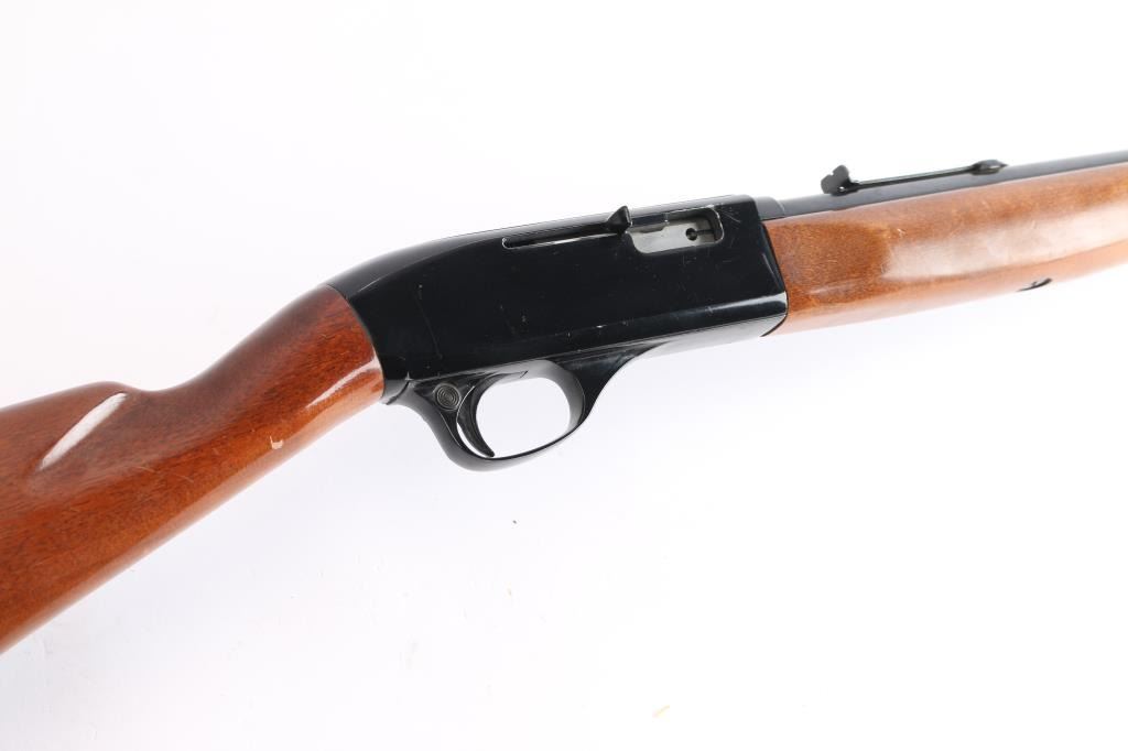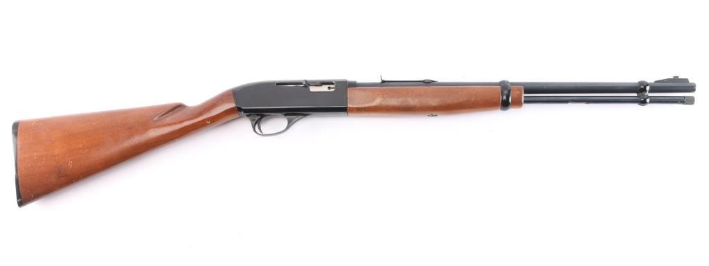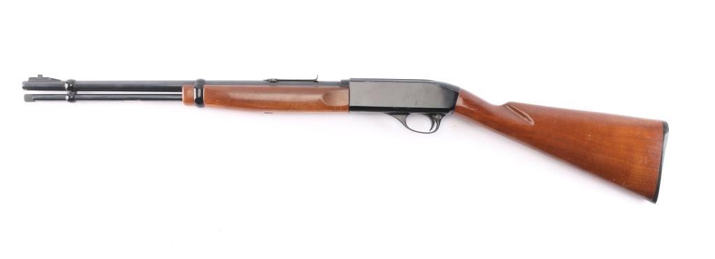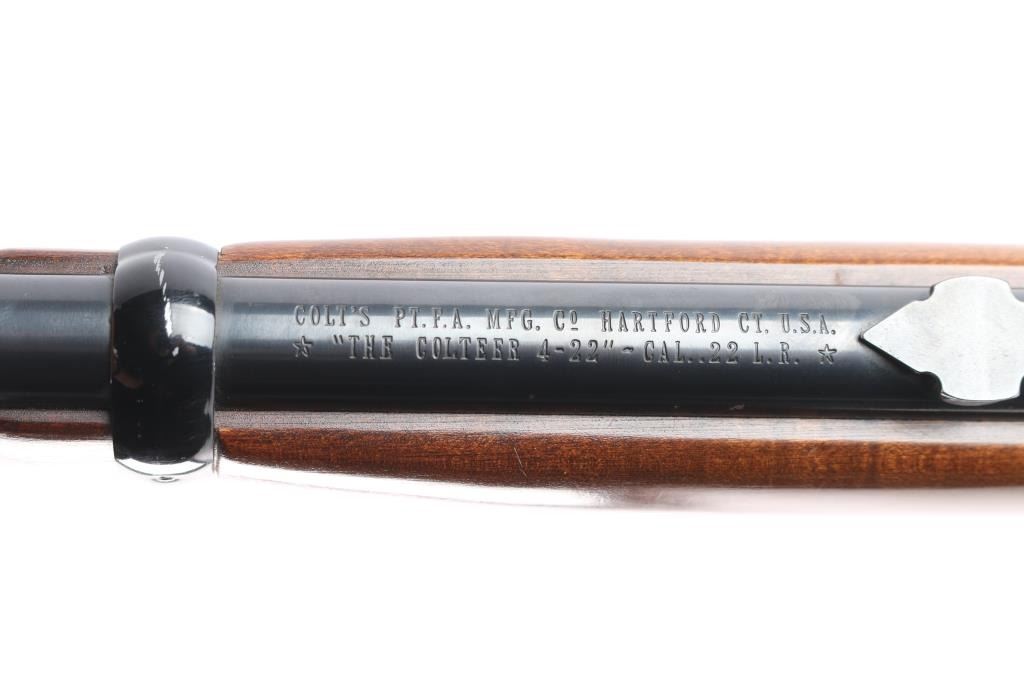 Semi-Auto Rifle With Tube Magazine. Made by Colt 1964-75. 19” barrel, full length tube magazine, raised blade/bead front sight, rear sporting sight (Missing lifter) grooved for scope. Blue barrel, matte black receiver, smooth walnut stock & forearm with factory 'Rampant Colt' buttplate, push button safety, small serrated charging handle. Bore is very good/bright, wood is sound with minor scratches/scuffs, black receiver has minor edge wear, scratches, blue barrel is very good. Somewhat rare.