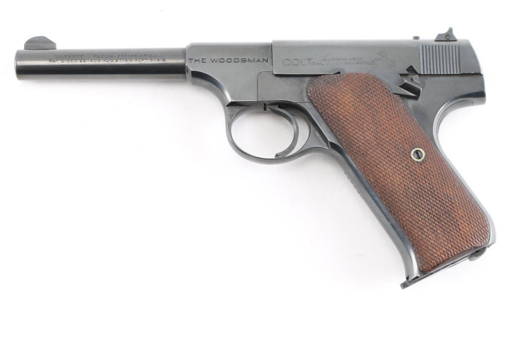 Pre-war first series semiautomatic rimfire pistol manufactured circa 1937. The First Series refers to all those built on the S frame as it existed prior to and during WWII. Features blued finish, checkered wood grips. 4.5" barrel, adjustable sights, push button magazine release, manual safety, serrated trigger. Bore is excellent/bright. Retains about 98% original blue, minor edge/muzzle wear, there is one tiny speck of pitting on the right frame behind the grip. Grips are very good condition. Includes (1) magazine.