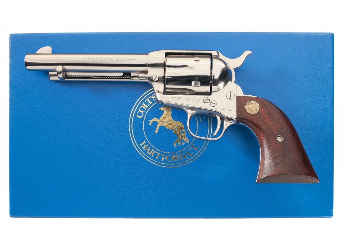 Manufactured in 1992. Standard markings with matching serial numbers on the frame and left side of grip straps under the grip. Fitted with smooth grips with silver Colt medallions numbered to the gun. With Colt factory blue box and shipping box numbered to the gun.